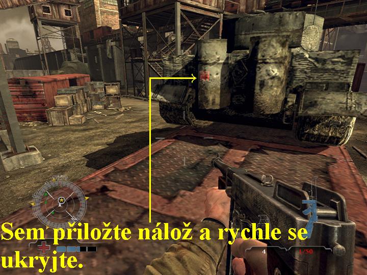 Konečně jste se tedy přesunuli na území Německa, ale ještě nejásejte, fašisté jsou stále ještě dosti silní, aby vám v dalším pokračování vše důkladně znechutili a znesnadnili. Po skončení briefingu a výběru zbraní se znovu ocitnete společně s kamarády v letounu a ihned zjistíte, že jste obdrželi další úkoly. Zajistit musíte místo seskoku v továrně, zničit tři tanky na železničních vagónech, zlikvidovat zásoby munice, eliminovat železniční dělo, totálně zlikvidovat řídící středisko továrny na výrobu tanků a také zničit tlakové ventily. V reálu však tentokrát dostane váš letoun přímý zásah a všichni vaši kamarádi budou zabiti, rychle tedy vyskočte z letounu sami a řiďte váš padák tak, abyste měkce a přesně přistáli na místo uprostřed továrny, označené zelenou světlicí. Zde už kupodivu bojují vaši spojenci, zřejmě výsadkáři z jiného než z vašeho letounu. Vyčistěte tedy společně s nimi tovární nádvoří od fašounů, poté si po prvních schodištích prostřílejte cestu nahoru, tak dojdete k tlakovému ventilu, na který přiložte nálož, odstupte do bezpečné vzdálenosti, explozí jste splnili část prvního úkolu. Po dalších schodištích se dostanete k dalšímu tlakovému ventilu, i ten zlikvidujte pomocí nálože, tím je kompletně splněn váš první úkol. Vraťte se dolů a podle kompasu se vydejte k tanku, uloženém na nákladním vagónu, zlikvidujte nejdříve skupinu fašistů, ať vás neohrožují při plnění dalšího úkolu, poté si vyskočte k tanku nahoru na vagón a na tank přiložte nálož, tak tank zlikvidujete. Prostřílejte si cestu k dalšímu vagónu, na kterém je naložen tank, zlikvidujte ho stejným způsobem. Podle kompasu vyhledejte třetí tank na vagónu, i ten zlikvidujte pomocí nálože, tak jste v plném rozsahu splnili druhý úkol0000008828_n03.jpg (86965 bytes) (obr.3). Nyní se tedy podle kompasu vydejte k železničnímu dělu, i na něj přiložte nálož a rychle ustupte, po explozi je dělo zničeno a vy jste splnili další úkol. Jakmile obdržíte příkaz zničit výrobní středisko továrny na výrobu tanků, objeví se vám na kompasu nový cíl, vydejte se tedy do tohoto střediska podle kompasu a z vašich ručních zbraní rozstřílejte všechny řídící panely, máte splněný další úkol. Nyní po schodišti vyběhněte nahoru k hlavnímu vchodu do tovární haly, vstupte dovnitř, zlikvidujte fašouny, po schodištích se prostřílejte až dolů do přízemí. Vzadu je německý kulomet MMG, zalehněte za něj a použijte jej proti náckům, dokonce se vám už tady stavějí na odpor první Esesmani v černých uniformách a červenou páskou na rukávě. Poté se otočte a slezte dolů po žebříku, ve sklepení je obrovské skladiště munice. Najděte vozík, na kterém je červený terčík, přiložte na něj nálož a rychle utíkejte vpřed, odbočte doleva na schodiště a proběhněte ven na tovární nádvoří dveřmi, které se vám nyní po splnění tohoto úkolu zpřístupnily. Odtud pokračujte doleva, prostřílejte si cestu až na konec, jakmile zlikvidujete všechny nacisty a Esesmany, spustí se animace, v níž se otevřou vrata a z nich vyjede ven lokomotiva. Zároveň se ale objeví velice nebezpečný Esesman v plynové masce, kterého v reálu ihned co nejdříve zlikvidujte. Poté zlikvidujte i ostatní fašouny po okolí i na rampách, vlevo po schodišti si vyběhněte nahoru, utíkejte po rampách tak, abyste se dostali nad lokomotivu, přes zábradlí si na ni seskočte. Na ní na červeně označené místo přiložte nálož, otočte se zpět a přeskakujte přes vagóny až na konec, skrčte se před spodky lávek a tak postupujte stále vpřed, cestou ještě musíte uložit další dvě nálože na červeně označená místa. Jakmile nastane exploze a vy doběhnete až na konec, operace končí, vyslechněte si a shlédněte hlášení vašeho velitele o úspěšně zakončené operaci, ovšem za cenu obrovských vlastních ztrát, no vy jste přežili a budete nasazeni do poslední operace v této hře.