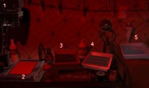 "Dark Room Misc.". Je v nej návod, ako vytvárať fotky. Otoč sa a vojdi do dverí
