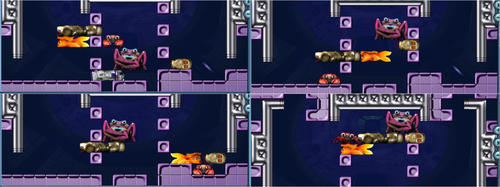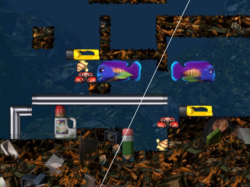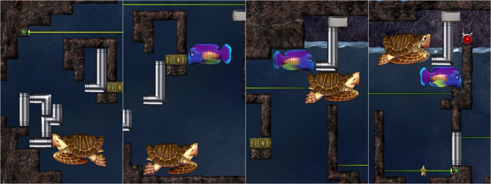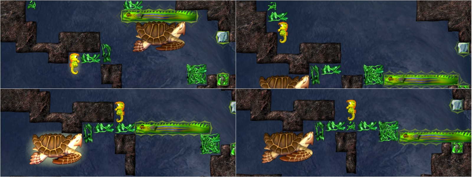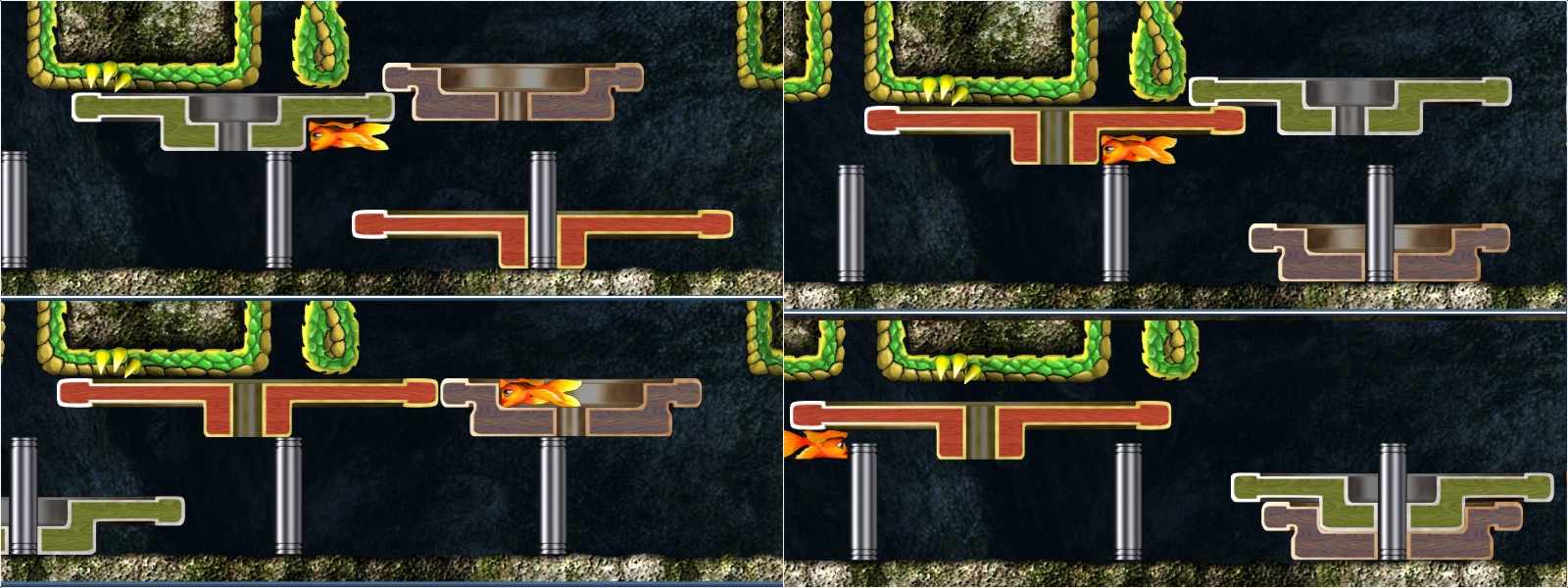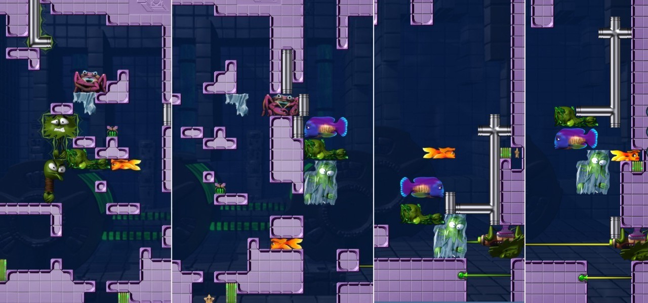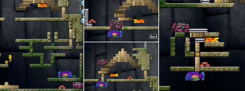 Želvu a ta zapluje do trubek a přenese je doprava (4). Zde se spustí dolu a