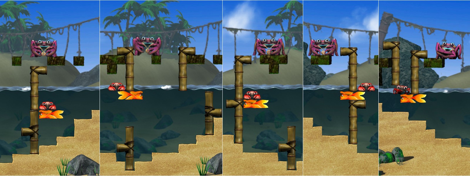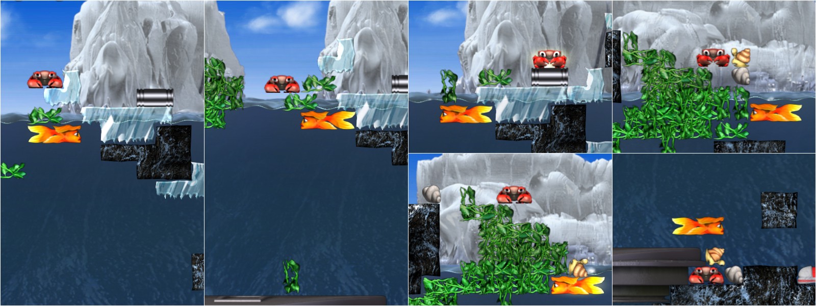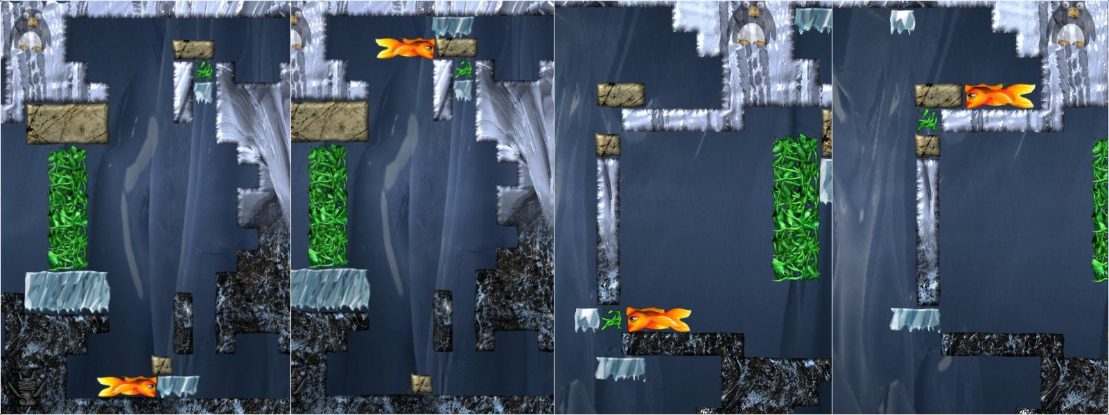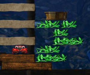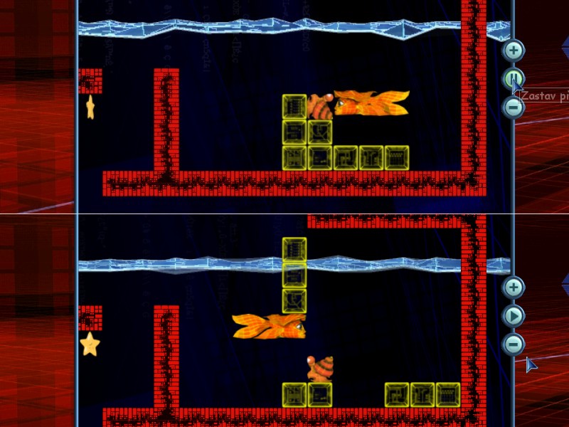 krab vyleze doleva nahoru. Pak Tinou posuňte led doprava a poté co vypluje