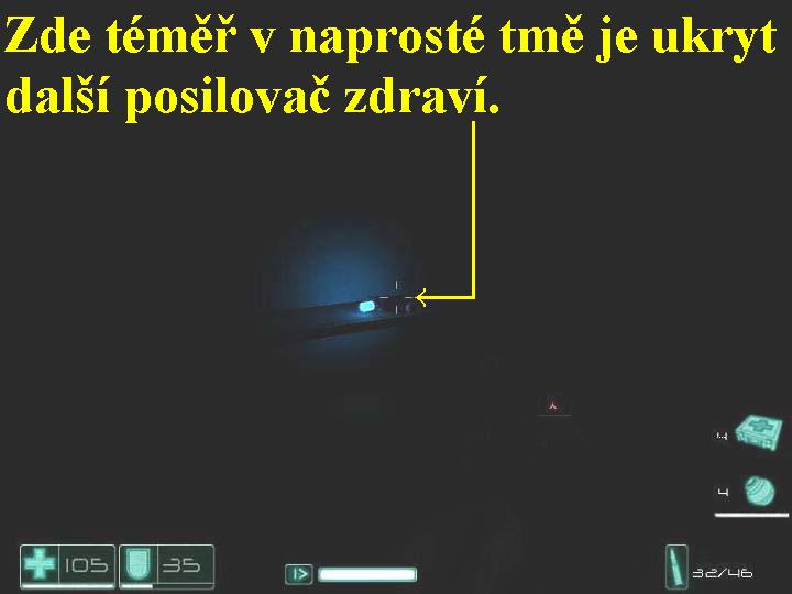 Kontakt s okolním světem je zcela nemožný, neboť jakási neznámá síla znovu oživila vojáky Replicu. Jin-Sun-Kwon a Douglas Holiday jsou již na cestě, aby se s vámi setkali, uprchněte tudíž před vojáky Replicu a setkejte se s Jin-Sun-Kwonem a Douglasem Holidayem. Seskákejte tedy opatrně dolů po lešení, seberte lékárničku, popojděte vpřed a rozstřelte bednu, posbírejte náboje a posilovač, zvětší se vám teď kapacita vašeho zdraví na hodnotu 105, zabočte doprava a projděte dveřmi. Odbočte doleva a na konci vpravo projděte dalšími dveřmi, zabočte doleva, na konci vejděte do dveří vpravo, seberte lékárničku a brokovnici. Pokračujte doleva, hned poté ještě jednou doleva, vstupte otevřenými dveřmi vpravo do místnosti, postřílejte vojáky a seberte náboje a lékárničku. Projděte dírou vlevo ve zdi, kudy se sem probourali nepřátelé, rozstřelte další bedny (i bedny rozstřelujte soustavně, ani na to už nebudu dále upozorňovat) a posbírejte vše užitečné, zabočte doprava, postřílejte nepřátele a přeskočte přes přepážku na zemi. V regále vpravo i před vámi jsou další bedny plné užitečných věcí, odbočte vlevo a hned vpravo, vlevo projděte dveřmi a pokračujte chodbou dál doleva. Zabočte dvakrát po sobě doprava, seběhněte dolů po schodišti, vstupte do vchodu vpravo, můžete na zemi rozstřílet plynové láhve, pokračujte doprava, prostřílejte si cestu vpřed, zabočte do chodby vlevo. Opět si prostřílejte cestu dopředu, na konci odbočte doleva a vyběhněte po schodišti nahoru, vstupte do dveří vlevo. Zabočte doprava, poté mezi regály doleva, na konci projděte dveřmi vpravo, pokračujte doprava. Seběhněte dolů po schůdcích a nahoru po protějších, projděte dveřmi. Za nimi odbočte doleva a seskočte dolů, vyběhněte na protější straně po schůdcích nahoru doleva, vydejte se do chodby vpravo, na konci projděte dveřmi. Vstoupíte do naprosté temnoty, zde vám nepomůže ani vaše baterka, v dálce před sebou spatříte světlo a vzápětí budete vrženi zpět před dveře. Vstupte znovu do dveří, ocitnete se v malé komůrce, ale zde nic nenajdete. Vraťte se tudíž zpět do chodby a projděte dveřmi doprava, pokračujte chodbou dopředu, vejděte do dveří vlevo, zabočte doleva do místnosti, na konci vstupte do dveří vpravo. Ze stolku posbírejte tříštivé granáty, docela vpravo v naprosté tmě je velice špatně viditelný ukrytý další posilovač zdraví0000009449_n02.jpg (36293 bytes) (obr.2), najděte ho a seberte ho, nyní jste si znovu navýšili ukazatel vašeho zdraví na hodnotu 110. Projděte dál protějšími dveřmi, vyběhněte po schodišti až nahoru, kde seberte granáty, rozstřelte kufr a poté bedýnku, získáte tak další granáty a munici. Seběhněte po schodech o poschodí níž, projděte protějšími dveřmi, poté i druhými, nyní jste se ocitli v kancelářích, plných nepřátel. Musíte je všechny pobít, u zdí kolem je munice a několik granátů, ze zdí sbírejte lékárničky. Prohledejte všechny okolní kanceláře a vyčistěte je od vojáků, najdete i spousty dalších užitečných předmětů. Z poslední kanceláře vběhněte do chodby, vyběhněte nahoru po schodišti, zde opět postřílejte všechny vojáky ve všech kancelářích a posbírejte vše užitečné. Na konci chodby seběhněte dolů po schodech, projděte doprava dvojdílnými dveřmi, přes několik místností se dostanete do chodby, kde za oknem spatříte přízrak Fettela. Pokračujte chodbou až na konec, projděte dveřmi, nacházíte se v kostelní modlitebně a mezi lavicemi spatříte přízrak Almy. Projděte dalšími dveřmi, objeví se Fettel a vyvolá požár, zřejmě vás chce usmažit jako topinku. Obraťte se čelem k ohni a couvejte dozadu, tak se vám na poslední chvíli za zády otevřou dveře, kterými vyběhněte ven, tak se před ohněm zachráníte. Dveřmi proběhněte na volné prostranství, přeskočte vlevo dvě cihlové zídky, tak tuto část zakončíte.