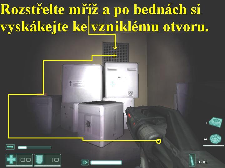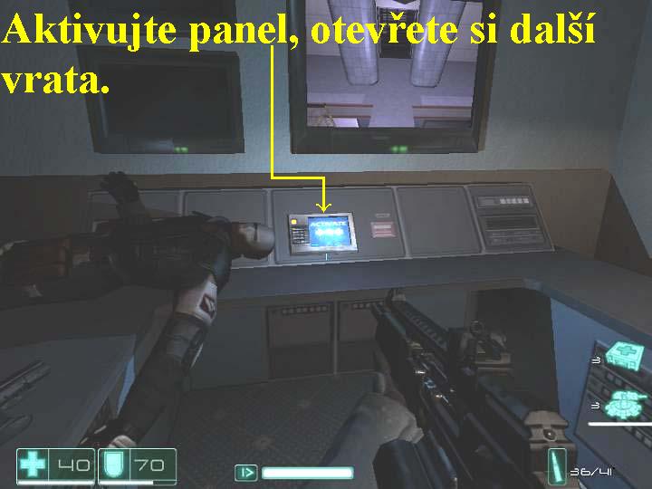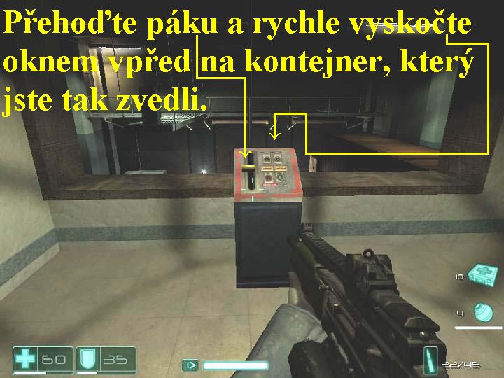 Vaši nepřátelé zajali technickou důstojnici F.E.A.R. Jin-Sun-Kwon a Douglas Holiday již je na cestě k vám. Dostaňte se přes nedalekou oblast ke skladišti a sejděte se s ním, společně potom vymyslete plán, jak Jin-Sun-Kwon osvobodit. Vydejte se tudíž dopředu, v bednách vlevo jsou zbraně, před vámi nahoře už vidíte střílejícího Holidaye, odbočte doleva, vyběhněte po šikmé rampičce nahoru, vlevo posbírejte ochranné pomůcky, pokračujte dál chodbou doprava. Před vysokozdvižným vozíkem odbočte doleva a dveřmi vlevo vstupte do malé místnosti, kde na stolku aktivujte červeně blikající panel telefonu, poté vyjděte ven a pokračujte rovně na druhou stranu chodby, postřílejte vojáky nahoře před vámi. Zabočte doprava a vyběhněte nahoru do protisměru po železném schodišti, vstupte na rampu dveřmi vpravo, postřílejte vojáky dole pod vámi. Přejděte doprava na konec rampy, seběhněte dolů po schodech, zlikvidujte další nepřátele, seberte lékárničku a ochrannou vestu. Jděte doleva a u zdi otvorem v podlaze proskočte níž, skrčte se a pokračujte lomenou šachtou dopředu, na jejím konci sejměte vojáka, vpravo po potrubí vyskočte výš. Odbočte doprava, na konci doleva, v místnosti postřílejte vojáky, jděte vpřed a držte se vpravo, tak budete mít halucinace, i v nich však likvidujte nepřátele. Po skončení vašich halucinací se vracejte zpět, vpravo projděte vraty, která ještě před chvílí byla pouze pootevřená a tudíž nepřístupná. Na dálku si promluvíte s Holidayem a s Jin-Sun-Kwon, vlevo na konci přívěsu náklaďáku seberte zbraň, munici a posilovač reflexů. Seskočte dolů, obejděte místnost zprava, přeskočte bednu a projděte dál dveřmi, označenými červeným nápisem EXIT. Pokračujte doleva lomenou chodbou, na jejím konci vstupte do místnosti vlevo, nad vámi už bojuje Holiday, pomozte mu při likvidaci nepřátel, zde se velice dobře hodí používat i granáty (G). Prohledejte všechny okolní a přilehlé místnosti i další prostory nad schodišti, najdete mnoho užitečných předmětů a dokonce další posilovač reflexů. Přejděte na protější stranu, vyskočte na rampu, přejděte po ní na druhou stranu, odbočte doleva a z chodby projděte dál dveřmi. Pokračujte chodbou, tak vstoupíte do haly, kde postřílejte vojáky, na protější straně vyběhněte po schodišti nahoru a projděte dveřmi. Posbírejte vše užitečné, projděte dveřmi vlevo, kde v místnosti přehoďte páku na panelu0000009449_n03.jpg (72193 bytes) (obr.3), tak zvednete jeřábem modrý kontejner, na který si oknem před vámi přeskočte a z něj přeskočte doleva na rampu. Na jejím konci vlevo projděte dveřmi, seberte lékárničku, skrčte se a prolezte ven, seskočte dolů na dvůr. Pokračujte doprava, vyskočte na ložnou plochu náklaďáku, po ní pokračujte doleva, zabočte doprava a postřílejte nepřátele. Po pravé straně je lékárnička, o kousek dál před vámi další, levou stranou si prostřílejte cestu dopředu, na konci odbočte do vchodu vlevo. Zabočte doleva na schůdky, vpravo vyběhněte nahoru po schodišti a projděte dál dveřmi vlevo. V místnosti seberte lékárničku a brnění, pokračujte doleva a zkuste vstoupit do dveří vlevo, ale nepůjde to. Za nimi jsou schůdky vedoucí doleva, vyběhněte po nich, vpravo projděte dveřmi s červeným nápisem EXIT. Seběhněte dolů po schodech, vpravo vstupte do dveří, rozstřelte dveřní okno a do místnosti vhoďte granát, poté dveřmi projděte. Z místnosti vlevo za širokým oknem zlikvidujte přeživšího vojáka, z pravé zdi seberte lékárničku a ze stolku granáty, pak si vyskočte na stůl, skrčte se a oknem prolezte. Pokračujte dál vchodem vlevo, zabočte doprava, ze země posbírejte střelecké věže (jsou to automaticky řízené střelecké věže, ty můžete použít klávesou G), na konci zabočte doprava a projděte dveřmi doleva. V místnosti seberte lékárničku, rozstřelte sklo, vyskočte na stůl, skrčte se a vylezte oknem na bednu dole pod vámi. Zde vás napadne veliký a hodně nebezpečný houfec nepřátelských vojáků, zde se vám budou hodit střelecké věže, granáty a zpomalovací mód (levý Ctrl). Procházejte tedy mezi bednami, navíc se kryjte, na ložné ploše náklaďáku posbírejte lékárničky, munici, granáty a další střelecké věže, seberte i posilovač zdraví, tak si zvětšíte kapacitu zdraví na hodnotu 115. Přebíhejte i po deskách na horní strany beden a kontejnerů, likvidujte nepřátele, jakmile se zbavíte všech odpůrců, vyběhněte nahoru po malých schůdcích, seberte lékárničku a lepší zbraň, pak projděte dvoukřídlými dveřmi, které vám otevřel Holiday, odbočte doprava poté doleva, Holiday vás bude sám následovat, pomůže vám i likvidovat nepřátele. Na konci chodby odbočte doleva, z regálu seberte lékárničku a pokračujte protějšími dveřmi dál.