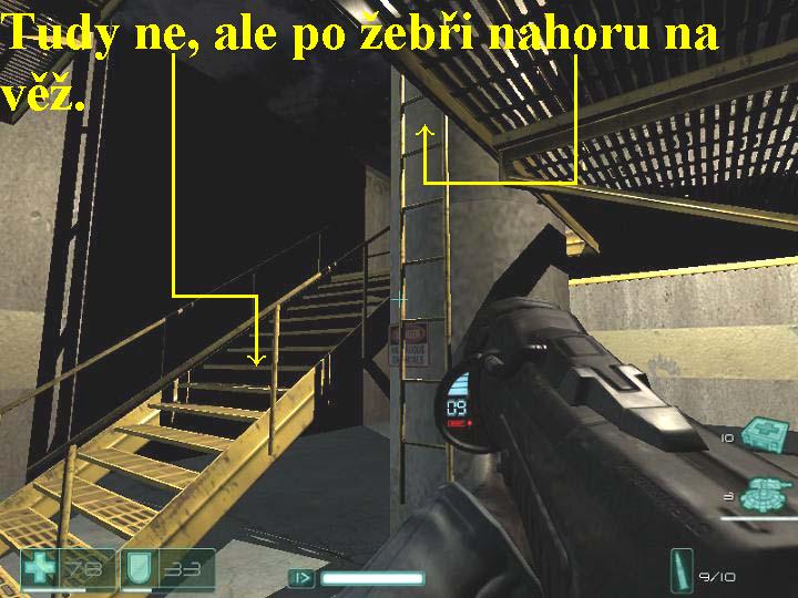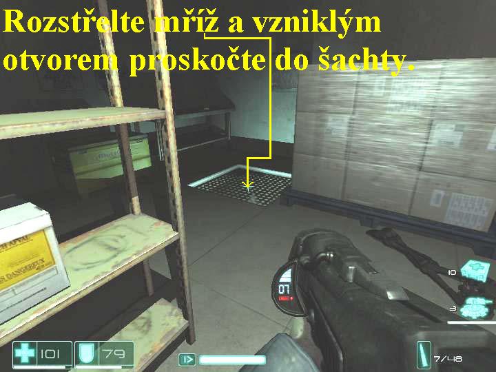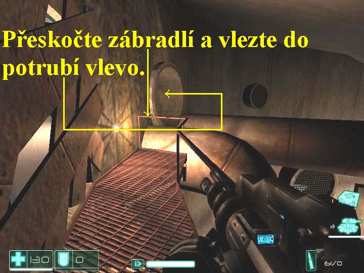 Organizace Replica používá městské metro pro transport vybavení a zásob, kam je ale odvážejí, o tom nemáte ani potuchy. Běžte tudíž po kolejích metra až k východu u Aurbunské pamětní nemocnice, vaším druhotným úkolem je získat informace o aktivitách oddílů Replica v systému metra. Vydejte se tunelem dopředu, tak dojdete Almu, která vám pomůže zlikvidovat několik nepřátel. Pokračujte stále vpřed, postřílejte vojáky po levé straně na nástupišti, přeskákejte si tam a pravou stranou přes kolejiště seběhněte dolů ke dveřím dříve, než vás smete přijíždějící vlaková souprava. Projděte těmito dveřmi a v chodbě pokračujte doprava, vlevo na zdi seberte lékárničku, zabočte doleva, narazíte na mrtvolu. Ustřelte zámek u dvoudílné brány vlevo, vejděte dovnitř, skrčte se a projděte šachtou přes několik dveří a místností, v nichž naleznete mnoho užitečných předmětů se tak vrátíte nazpět ke zmíněné mrtvole. Nad schůdky projděte dveřmi, v místnosti se zbavte nepřátel, vylezte nahoru po žebříku, jděte po rampě na konec, v malé místnosti seberte lékárničku. Vraťte se a slezte po žebříku zpět dolů, pokračujte doleva, na konci vpravo vyběhněte nahoru po schodišti, postřílejte vojáky, za rožkem vpravo si můžete vyměnit zbraň, vlevo od dveří seberte lékárničku a poté dveřmi projděte. V místnosti na jejím konci vylezte nahoru po žebříku, projděte chodbou, na jejímž konci slezte po žebři dolů, projděte dveřmi. Na kolejích vlevo zničte dvě automatické střelecké věžičky, zabočte doleva a vstupte do posledních dveří vpravo. Jakmile jimi projdete, budete mít halucinace, po jejich skončení pokračujte chodbou vpřed, projděte dalšími dveřmi, na konci chodby vyberte předměty z regálu a vlevo postřílejte zdálky několik nepřátel. Vyběhněte doleva po schodech, zbavte se přeživších vojáků, seberte lékárničku, na druhé straně vyběhněte nahoru po schodišti, seberte další lékárničku a projděte dveřmi. Na konci chodby odbočte doprava, projděte dveřmi vpravo, pokračujte chodbou dopředu, likvidujte vojáky, sbírejte lékárničky, projděte dveřmi a zbavte se nepřátel vpravo. Přeskočte převrhnutou poličku, v místnosti pobijte vojáky, odbočte na druhé straně za roh doleva, přeskočte potrubí a postřílejte další nepřátele. Vstupte do protější chodby, lomenou chodbou se vydejte dopředu, při první příležitosti odbočte dvakrát po sobě doleva a v podlaze před vámi rozstřelte mříž, vzniklým otvorem potom proskočte dolů do chodby0000009449_n07.jpg (50059 bytes) (obr.7). Vlevo střelte do bedny, tak z ní vypadne posilovač zdraví, pakli ho seberete, kapacita vašeho zdraví stoupne na hodnotu 125. Nyní se vracejte doprava, odbočte vlevo, vběhněte do zatopené místnosti na rampu a na jejím konci seběhněte po schůdcích vpravo do vody, jděte k žebříku a lezte po něm nahoru. Asi v polovině žebře je v chodbě voják, včas ho sejměte, pokud vás srazí, pošlete mu ze země nahoru „pozdrav“ z nějaké razantní zbraně, pak vylezte po žebři znovu až úplně nahoru. V místnosti seberte lékárničku a po druhém žebři si vylezte do chodby výš, odbočte doprava a sejměte vojáka s lehkým kulometem. Odbočte na rampu vlevo, vpravo seběhněte dolů po schodech, pokračujte lomenou chodbou doprava, sbírejte lékárničky, v místnosti s kabely na zemi projděte dveřmi doprava. V chodbě odbočte doprava, jděte chodbou dopředu, zabočte vlevo a vpravo projděte dál přes dvoudílné dveře. Vejděte do místnosti vlevo, otočte se a nad vámi střelte do barelu s trhavinou, ten vybuchne a vy se tak lehce zbavíte nepřátel, tam se ukrývajících. Z regálů posbírejte vše co lze, mimo jiné tak získáte další posilovač zdraví a teď tedy činí hodnota jeho ukazatele 130. Projděte vlevo dvoukřídlými dveřmi, seberte lékárničku a seběhněte dolů po schůdcích, vlevo se nachází místnost s generátory a se spoustou nepřátel. Zde použijte z vašeho inventáře střelecké věžičky (G), vhodně je rozestavte, použijte i zpomalovací mód (levý Ctrl), tak velice snadno nad nepřátelskou přesilou zvítězíte. Jakmile prostor vyčistíte, obejděte místnost zprava, sbírejte vše užitečné, tak projdete nazpět do místnosti s generátory. Vyběhněte nahoru po schodišti, vstupte do místnosti vlevo, zbavte se nepřátel a místnost prohledejte, poté pokračujte dál chodbou v protisměru. Téměř před koncem této chodby vstupte do dveří vlevo, budete mít vize, seběhněte dolů po schodech, vstupte do dveří vpravo. Zbavte se přízraku a seberte lékárničku, vyběhněte schody vpravo, vstupte do dveří vlevo. Pod schůdky pokračujte dál dveřmi vpravo, sejděte po schůdcích k řídícímu pultu, odbočte vlevo a vlevo za rohem rozstřelte na zdi mříž, skrčte se a vlezte do větrací šachty. Rožněte si baterku, lezte šachtou dopředu, na jejím konci vylezte nahoru po žebříku, další šachtou prolezte až na konec, popojděte dopředu a propadnete se dolů, to je konec této části.