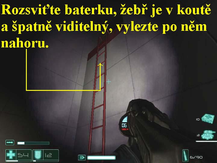 Je očividně zřejmé, že nemocnice byla zcela vypleněna, všude se povalují mrtvoly příslušníků SFOD-D, neznámá síla vyřadila z provozu i výtah, ve kterém se nalézáte. Vaším úkolem tudíž je výtah znovu zprovoznit a dostat se na střechu nemocnice. Vyjděte tedy ven z kabiny porouchaného výtahu, projděte protějšími dveřmi a zabočte do chodby vlevo, vpravo na recepčním pultu je lékárnička, zabočte doprava a vstupte do dveří, označených jako SECURITY OFFICE (Bezpečnostní kancelář). V místnosti seberte zbraň a lékárničku, zespodu rozstřelte mříž nad bílými bednami, po těchto bednách si vyskákejte až nahoru k takto vzniklému otvoru, skrčte se a vlezte do šachty0000009449_n11.jpg (48640 bytes) (obr.11). V šachtě si rozsviťte baterku, odbočte doprava, znovu doprava, opět doprava a poté doleva, na konci šachty proskočte níž otvorem v podlaze, rozstřelte mříž pod nohami, propadnete se do místnosti. Vydejte se doprava, dojde k výbuchu, rozstřílejte přízraky, projděte dveřmi a odbočte doprava do chodby. Pokračujte doprava a projděte dvoudílnými dveřmi, z místnosti vyjděte ven dvoudílnými dveřmi vlevo, v chodbě odbočte doleva a projděte dalšími dveřmi. Pokračujte pravou stranou vpřed do další chodby, přistupte ke dveřím vpravo, přepadnou vás halucinace, v nichž se propadnete do místností, plné stříkanců krve. Pokračujte vpřed otevřenými dveřmi, projděte i druhými, seběhněte dolů po schůdcích, jděte doleva, vstupte do dveří vpravo. Pokračujte dál dveřmi do protisměru, vstupte do chodby, zabočte doleva do další chodby, postřílejte bestie, na konci chodby je několik vězeňských cel, v jedné z nich je na zdi teleport, projděte jím a ocitnete se v uzamčené cele. Vydržte chvíli, neboť dveře se posléze samy otevřou, projděte jimi do chodby, postřílejte bestie, na konci chodby zabočte doleva a projděte dveřmi. Odbočte do chodby vlevo, popojděte vpřed, přepadnou vás další halucinace, jakmile vás přejdou, pokračujte chodbou dopředu, odbočte doprava a projděte protějšími dvoudílnými dveřmi. V chodbě odbočte doprava, projděte dveřmi, přes následující dveře se vracejte zpět až na místo, kde jste začínali, tedy ke kabině výtahu. Po cestě seberte v chodbě z podlahy posilovač reflexů, pokračujte chodbou stále vpřed, zde se zabloudit nedá. Můžete po cestě prohledávat i přilehlé místnosti za dveřmi z chodby po obou stranách, najdete tak spousty zbraní, munice a lékárniček, hlavně však musíte dojít hlavní chodbou až na konec na místo, kde jste opustili porouchaný výtah. Nastupte do výtahové kabinky, stiskněte tlačítko a už si to jen odfrčíte do poslední, tedy závěrečné mise.