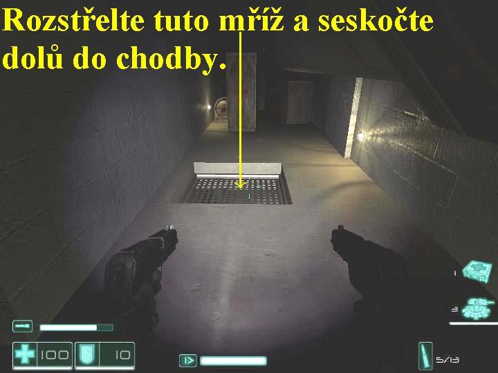 Takže jste se dostali přes rozsáhlá skladiště až ke stanici metra. Rozvětvený systém jeho tunelů je propojen s nemocniční čtvrtí v centru města. Jin-Sun-Kwon šla sama napřed a teď tam někde na vás čeká. Projděte tudíž terminálem metra až na koleje, po nich se potom dostaňte až ke zdravotnímu středisku. Vydejte se tudíž dopředu, seběhněte dolů po několika schodištích, na konci chodby odbočte doprava a pokuste se vstoupit do dveří vpravo. Dostanete halucinace, v nich spatříte ženskou postavu, po jejich skončení se vydejte dopředu a vstupte vpravo do dveří. Seberte lékárničku a projděte dál protějšími dveřmi, postřílejte vojáky, poté co je zlikvidujete, pootevřou se před vámi vrata, zastřelte dalšího vojáka, který jimi vyšel, nato se skrčte a vrata podlezte škvírou pod nimi, odbočte doprava, na zdi vlevo seberte lékárničku, na konci vpravo si můžete, pokud ho již ovšem nemáte, sebrat raketomet. Projděte dál dvoudílnými dveřmi doleva, zabočte do chodby vpravo, na jejím konci vchodem po levé straně vstupte do veliké haly. Zde nejdříve postřílejte vojáky, všimněte si, že vpravo na zdi je lékárnička. Poté, co vojáky zlikvidujete, na protější straně výtahem k vám dolů přijede známe monstrum, odolný mechanický robot. Jak s ním bojovat, to byste už měli znát, už jste se s ním jednou setkali, nicméně se dobře kryjte, před jeho střelami uskakujte do stran, schovávejte se za neprůstřelné předměty, pamatujte na lékárničku, na kterou jsem vás upozornila a hlavně používejte raketomet, to je totiž zbraň, která na něj platí nejvíce, po několika přesných zásazích jej rozdrtíte na padrť. Jakmile se tohoto super monstra zbavíte, na konci vlevo se otevřou dveře a jimi k vám vpadne několik dalších vojáků, ty samozřejmě zlikvidujte také. Poté vstupte do stejných dveří, kterými sem přišli vojáci a které vám za sebou ponechali otevřené. Pokračujte dál přes protější dveře, odbočte doprava, projděte dveřmi vlevo, otevřete si protější dveře a projděte jimi, za nimi odbočte vpravo, potom vstupte do dveří vlevo, pokračujte dál protějšími dveřmi, na zdi seberte lékárničku, projděte dveřmi před vámi. V chodbě odbočte doprava, o kousek dál vstupte do dveří vpravo. V místnosti nejdříve postřílejte všechny vojáky, přejděte na druhou stranu místnosti a docela vpravo na podlaze rozstřelte mříž a takto vzniklým otvorem proskočte dolů0000009449_n06.jpg (72920 bytes) (obr.6), seskočili jste do chodby, kterou pokračujte až na samý konec, kde vylezte nahoru po žebříku. Tak se ocitnete v místnosti, kde na zdi seberte lékárničku, poté na řídícím pultu vlevo přehoďte páku, tím jste si zpřístupnili dveře za vašimi zády, projděte jimi a vstupte do chodby. Z chodby vlevo se k vám probourají zdí vojáci, postřílejte je, poté jděte k vybourané zdi a vlevo seběhněte dolů po schodišti, zabočte doprava a vstupte do dveří vlevo s nápisem AUTHORIZED PERSONNEL ONLY (Vstup povolen jen oprávněným osobám). V chodbě pak odbočte vlevo, hned na začátku seberte ze zdi lékárničku, zabočte doprava a v místnosti pobijte nepřátele, pokračujte doprava. Prohledejte místnost vpravo, seberte lékárničku, poté pokračujte dál dveřmi vlevo. V chodbě nalevo na zemi jsou lékárničky, dále však pokračujte dopředu mezi levými turnikety, seběhněte dolů po schodišti, zlikvidujte monstrum a vojáky. Jděte doprava a za nápojovými automaty vpravo na zdi rozstřelte pravou mříž na zdi, vyskočte si do vzniklého otvoru, skrčte se, rožněte si baterku a vlezte si do takto zpřístupněné větrací šachty, rozstřelte i protější mříž a na konci šachty seskočte dolů a pokračujte další šachtou vpřed. Zachvátí vás halucinace, ale pokračujte dále dopředu, sviťte si baterkou, u ventilátoru zabočte doprava a obejděte celou šachtu, po skončení další halucinace pokračujte bludištěm šachet stále vpřed. Je zcela lhostejné, kudy půjdete, hlavně je nutné seskákat až úplně dolů. Tak se spustí animace, po jejím skončení na konci šachty seskočte dolů do chodby, pokračujte doprava, v místnosti slezte dolů po žebříku. Z polička seberte posilovač zdraví, rozšíříte si tak kapacitu zdraví na hodnotu 120, vezměte si i granát, pokračujte dál vchodem doleva, seběhněte dolů po schodišti, odbočte doprava. V místnosti vlevo za dveřmi najdete brnění, poté pokračujte chodbou vpřed, na konci dvoudílnými dveřmi projděte do řídící místnosti. Na řídícím pultu přehoďte páku, tak si otevřete mříže, vedoucí ke kolejím, vstupte do vchodu s nápisem EXIT (Východ) a projděte dveřmi, označenými nápisem KEEP OUT (Nevstupovat). Ihned za nimi budete napadeni průhlednými přízraky, jsou velice hbití, mrštní a čilí, navíc i špatně viditelní, zůstaňte tudíž stát mezi dveřmi, odkud je likvidujte ze zbraně nejtěžšího kalibru, kterou máte současně u sebe. Opatrně potom pokračujte až do poslední kanceláře, tak poslední z bestií převrátí polici a zaútočí na vás, skolte i ji, přeskočte polici a pokračujte dál cestou, kterou vám potvora zpřístupnila. Na konci projděte dveřmi, označenými nápisem NO TRESPASSING (Soukromý majetek), na chodbě za protějšími dveřmi odbočte doprava a v halucinacích pokračujte dál a střílejte na přelud, jděte až na konec, projděte dveřmi vpravo, hned poté vlevo. Jste opět na hlavní chodbě metra, pokračujte doleva a po schodišti vyběhněte na nástupiště, vpravo otevřenými dveřmi vstupte do vagónu, jděte doprava a na konci vejděte do tunelu, tím jste tady skončili.