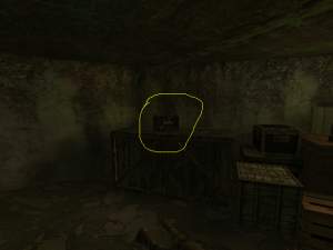 vľavo hore do bunkru. Otvorte dvere, zastreľte vojaka, a vpravo na stole zničte