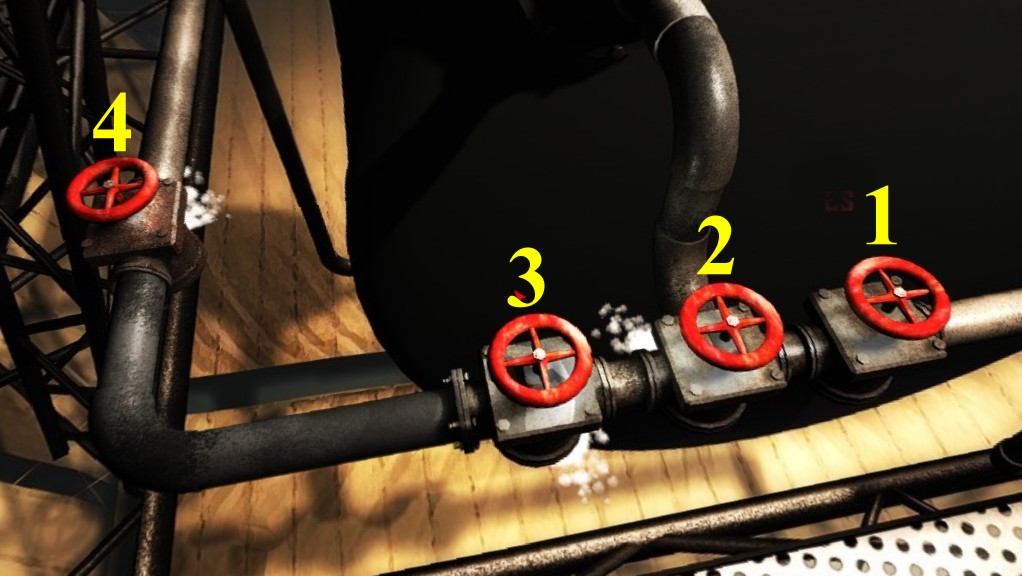 do předu ke dveřím a jděte doprava. Zde naleznete tři ventily (1 až 3) a