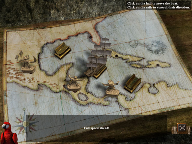 na pevninu. Podívejte se na kostru a nahoře vlevo si popovídejte s papouškem.