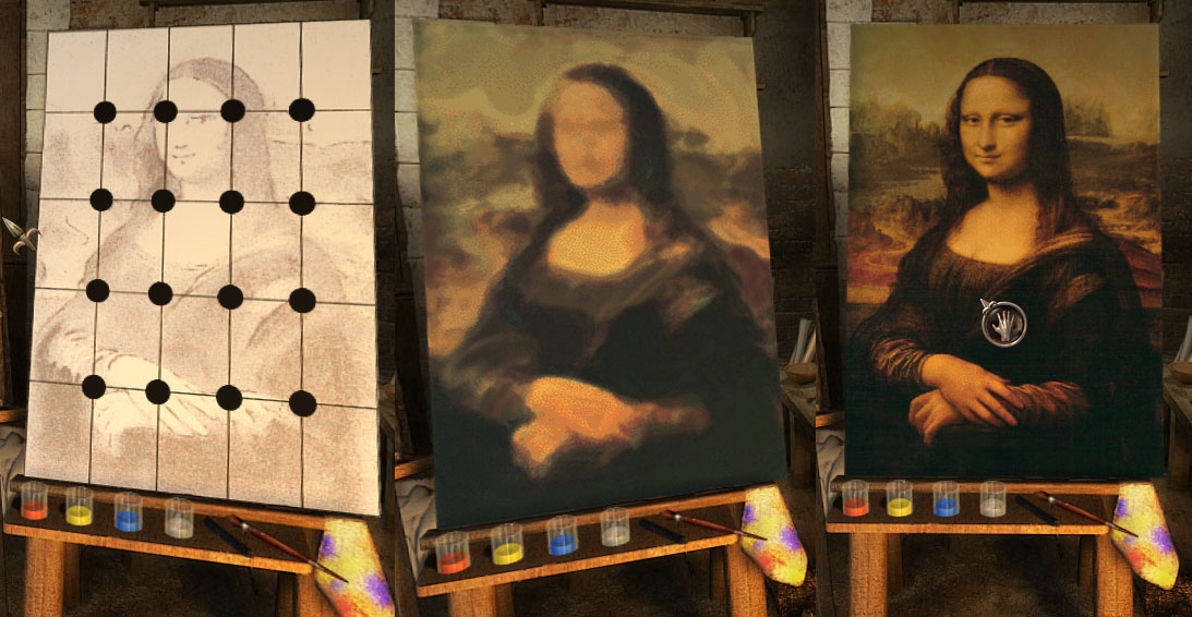 malujte na obraz, odlote tětec a seberte dokonalou kopii obrazu Mona Lisa.