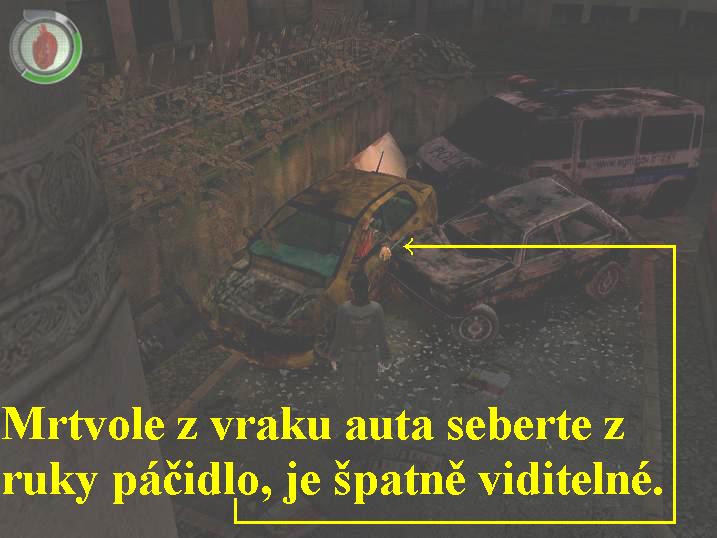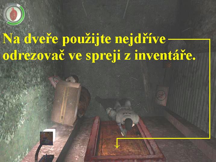 Po skončení poměrně dlouhé úvodní animace se ocitnete za plotem, popojděte tedy vpřed a ze země seberte dva bíle blikající předměty (D), jsou to zásobníky s náboji. Poté si můžete prohlédnout mrtvoly vojáků, tak zjistíte, že jsou to členové vojenského týmu „Tým 5“. Pokračujte do uličky vlevo, můžete i běhat (šipka vpřed+A), vstupte do otevřeného vchodu vpravo. Popojděte vpřed, přistupte k umírajícímu vojákovi z „Tým 5“, tak si s ním v animaci pohovoříte. V reále potom seberte naproti němu o zeď opřený samopal a projděte protějšími dveřmi. Jděte dopředu, seběhněte po dlouhém točitém schodišti až dolů, vydejte se ulicí až na samý konec. Tak dojdete k brance, z bedny seberte polovinu kabelu a projděte drátěnou brankou. Zabočte doleva a na konci uličky vlevo v rohu seberte červený sprej, je to odrezovač. Tudy ale cesta dál nevede, takže se vracejte zpět, projděte brankou, vyběhněte po schodišti zpět nahoru, projděte dveřmi a kolem mrtvoly vojáka se vraťte zpět na ulici. Zabočte doleva, o kousek dál vstupte vlevo do zelených dveří, před tím ještě seberte vpravo od nich ze zdi noviny, které si v inventáři přečtěte. Jděte vpřed, sestupte dolů po schodišti, na konci uličky zkuste projít dveřmi, ale zjistíte, že to nejde. Takže použijte z inventáře (M) odrezovací sprej (v inventáři zvolte ITEMS a poté USE), tak v animaci dveře našplícháte a poté v reále již jimi hladce projdete0000010150_n01.jpg (63374 bytes) (obr.1). Za dveřmi odbočte doprava, sejděte dolů po schodech, na konci uličky vidíte vchod, do kterého vběhla nějaká postava, ale dveřmi za ním neprojdete. Proto odbočte doprava, pokračujte vpřed, na konci projděte dveřmi, popojděte vpřed, v animaci spatříte Zombii, jak si pochutnává na mrtvole vojáka. V reále tedy Zombii skolte (S+D), (před tím opět otevřete inventář M, ale nyní navolte WEAPONS a vyberte zbraň, potvrďte výběr USE), jděte k mrtvole a seberte jí svazek klíčů, vlevo od ní potom popsaný blok, který si opět přečtěte v inventáři. Pokračujte dál, na konci vpravo seberte dva uzdravující balíčky, projděte dveřmi vlevo. Vydejte se dopředu, odbočte doprava, na barelech se nacházejí nůžky, které seberte. Nyní trošičku odbočím a vysvětlím vám způsob ovládání. Hra se ovládá pouze klávesnicí, nebo gamepadem, myš můžete klidně odsunout stranou, neboť žádnou ovládací funkci ve hře nemá. Klávesy jsou nastaveny napevno, nelze je tedy v menu měnit. Funkční klávesy jsou tedy W, A, S a D, klávesa D je akční, dáváte pomocí ní příkazy a sbíráte jí předměty. Střelba se provádí klávesami S, tak připravíte zbraň do pohotovosti ke střelbě, přidržíte ji a klikáte na klávesu D, tímto způsobem tedy střílíte. Postava se ovládá všemi kurzorovými klávesami, můžete i utíkat (klávesa A+kurzorová šipka vpřed), inventář otevíráte klávesou M, v něm se pohybujete kurzorovými šipkami nahoru a dolů mezi WEAPONS, ITEMS a DOKUMENTS, vybíráte předmět kurzorovými šipkami levá, pravá, výběr potvrzujete klávesou D, předměty v ITEMS lze mezi sebou i kombinovat, klávesou H potom otevíráte mapu, kterou můžete posunovat všemi kurzorovými klávesami, vřele doporučuji ji používat. Pokud se týká ukládání hry, je toto řešeno poněkud svérázně, sami žádným příkazem hru neuložíte, musíte dojít až k tmavočervenému kruhu na podlaze, do kterého když vstoupíte, hra se automaticky uloží sama. Dbejte tedy na to, abyste měli stále dostatek munice, pečujte o své zdraví, neboť jestliže zemřete, musíte začínat vždy znovu od posledního uložení, což je skutečně nepříjemné. Tak to by bylo, doufám, že je to jasné, takže nyní zpět k návodu. Po sebrání nůžek si, pokud ještě používáte pistoli, vyberte z inventáře raději samopal, neboť o kousek dál budete napadeni Zombiemi, které samozřejmě zlikvidujte. Jděte až na konec, vlevo projděte dveřmi, zlikvidujte další Zombie, pokračujte dopředu a vyběhněte nahoru po schodišti. Nahoře na konci seberte další dva uzdravující balíčky a zásobník s municí, vpravo od nich noviny, které si přečtěte v inventáři. Všimněte si dveří před vámi, jsou uzamčeny řetězem se zámkem, tudy zatím ještě neprojdete, ale místo si zapamatujte, tudy budete později pokračovat dál. Nyní tedy pokračujte vpřed přes dveře s nápisem KALESAN, po projití jimi v chodbě zabočte doleva do dveří s nápisem WC. Uvnitř pobíhá černá bestie, která vám sice ubližuje, ale nelze ji zlikvidovat, jednejte tedy rychle, uhýbejte jí, z pravého umyvadla seberte zásobník s municí, z levého umyvadla potom kartáček na zuby. Zde podotýkám, že po chvíli budete řešit rébusovou hádanku a pokud jej použijete na zaprášený plánek na zdi, zjistíte řešení, no já vám ho stejně za chvíli popíši. Vraťte se do chodby, vstupte do protějších dveří, za nimi vpravo seberte krabičku s náboji, vlevo z regálu druhou polovinu kabelu, v inventáři obě půlky kabelů spojte dohromady. Vraťte se zpět na chodbu, odbočte doprava, projděte dveřmi a panel vlevo na zdi před roletovými vraty zkuste aktivovat, ale nepůjde to. Použijte tedy na něj nyní již spojený kabel, znovu panel aktivujte, ale roletová vrata se pouze nadzvednou, ale neotevřou se, příkon elektrického proudu je zřejmě nízký. Známou cestou se vraťte zpět do místnosti, kde jste sebrali z regálu druhou půlku kabelu, na zaprášený plánek hned za dveřmi vpravo použijte kartáček na zuby z inventáře, tak zjistíte, že zleva doprava musíte zapnout pojistky v pořadí 2, 4 a 5, poté na konci místnosti projděte doleva dveřmi, jděte chodbou až na konec. Zde přistupte k pojistkám, aktivujte je, tak si
