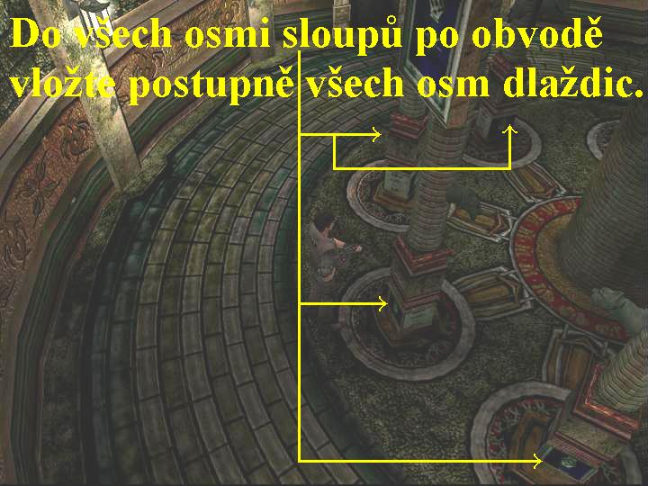 Dole ve studni pokračujte vpřed, na konci tunelu aktivujte mříž v podlaze, tak slezete po žebříku dolů do podzemních chodeb a místností. Sbíhejte po schodištích dolů,tak se v animaci opět setkáte se známým Inzarem, pokecáte si s ním a obdržíte od něj další rady a informace, poté se vypaří, jak to je jeho zvykem, jako pára nad hrncem. Jakmile se tedy ocitnete v reále, projděte dveřmi, otočte se a na jejich pravé straně zatáhněte za páku, tak spustíte mříže na druhé straně chodby a osvobodíte bestii, která vás ale vzápětí napadne, samozřejmě ji skolte, nejlépe laserovou pistolí. Mříže jste odstranili, takže pokračujte vpřed, vyběhněte po schodišti nahoru, vlevo seberte ozubené kolečko a projděte dveřmi. Za nimi po levé straně se nachází mrtvola vojáka, seberte jí její ruční kulomet, ze dveří seberte další dokument, který si v inventáři přečtěte, nezapomeňte sebrat ze země zapalovač. Všimněte si, že z tohoto místa vedou dál tři chodby, nejdříve tedy odbočte doleva a nad schody ve známém kruhu si hru nejdříve raději uložte. Poté pokračujte doprava, vyběhněte schody, vstupte do chodby, nad dalšími schody projděte dveřmi, tak jste se ocitli v kruhové místnosti. Zde se nachází osm sloupů, všimněte si na nich dole prázdných otvorů, musíte tedy nalézt osm kamenných dlaždic, které nakonec do těchto otvorů je nutné vložit. Protějšími dveřmi pokračujte vpřed, na zdi přehoďte páku, pokračujte chodbou dopředu. Vlevo v chodbě na levé straně přehoďte druhou páku, tak jste si spustili mříže před vámi, nyní musíte ale „pohnout kostrou“, neboť mříže se po chvíli opět zvednou. Seberte uzdravující balíček a na zdi přehoďte další páku, tak si spustíte protější mříž, rychle vběhněte do chodby. Jděte vpřed, tak se spustí animace, ve které monstrum vyrazí dveře, v reále bestii zabijte a uvolněným vchodem pokračujte vpřed. Vlevo seberte kamennou dlaždici (1), protějšími dveřmi pokračujte dál, posbírejte náboje a ostatní předměty ze soklů, seberte i knihu, kterou si v inventáři přečtěte, poté z panelů seberte kamennou dlaždici (2). Vracejte se zpět směrem k místu, kde jste si hru před chvílí uložili, napadnou vás další bestie, které zastřelte. Jakmile dojdete k ukládacímu místu, raději hru znovu uložte, poté vstupte do dveří naproti mrtvého vojáka, na konci chodby projděte dveřmi. Utíkejte na konec chodby, kde projděte dalšími dveřmi. V místnosti posbírejte uzdravující balíčky, munici a hlavně z panelu seberte kamennou dlaždici (3), vraťte se zpět a znovu si hru uložte. Přes dveře vstupte do další chodby, která se vám nyní zpřístupnila, na jejím konci seberte další kamennou dlaždici (4) a vraťte se zpět a znovu hru uložte. Nyní utíkejte do poslední chodby, kde dorazíte k dalším mřížím, u kterých je vpravo od nich páka. Pokud za ni zatáhnete, v animaci zjistíte, že v soukolí, které mříž spouští chybí kolečko a jedna osička se točí naprázdno. Do protějšího panelu tedy vložte kolečko z inventáře a znovu zatáhněte za páku, teď již mříže spustíte. Pokračujte chodbou vpřed, projděte dveřmi, pobijte několik bestií. Zabočte doprava, projděte dveřmi, na zdi vpravo přehoďte páku, nyní opět „pohněte kostrou“, spustili jste si sice mříž, ale ta se pochvíli opět znovu zvedne. Utíkejte tedy dopředu a rychle zabočte doleva, pokračujte chodbou vpřed, v další místnosti zatáhněte za páku, opět jste si spustili mříže. Vraťte se a odbočte doleva, projděte dveřmi, z panelu seberte antický klíč, ve výklenku vlevo další kamennou dlaždici (5), naproti ve výklenku je další (6). Nyní se vraťte zpět k mrtvému vojákovi, cestou likvidujte bestie a stoupnutím na kruh si raději znovu hru uložte. Nyní jděte k posledním dveřím, kterými jste doposud nemohli projít, otevřete si je antickým klíčkem, který jste před chvílí získali, vstupte dovnitř a zlikvidujte bestie. Pokračujte dopředu, z beden posbírejte náboje a zásobníky, také několik ozdravných balíčků, nezapomeňte sebrat pilku. O kousek dál naleznete mříže, které nelze nijak otevřít, použijte na ně pilku, tak v nich vyřízněte otvor, kterým projděte, uvnitř seberte další, kamennou dlaždici (7). Pokračujte dál, pobíjejte bestie a jděte k mřížím u nichž leží ozdravný balíček, seberte ho a projděte dveřmi. Na bedny použijte z inventáře zapalovač, tak bedny zapálíte, tyto shoří a vy můžete pokračovat dál, na konci opět projděte dveřmi. Pobíjejte další bestie, pokračujte vpřed prvními dveřmi vpravo, vlevo seberte poslední kamennou dlaždici 8), od ní vpravo dokument, který si v inventáři přečtěte. Posledními dveřmi vpravo neprojdete, ale toto místo si zapamatujte, neboť za chvíli, kdy budete hrát za Inzara, budou tyto dveře přístupné a i za nimi v lokaci budete muset pobít všechny bestie. Nyní se tudíž vracejte zpět až k mrtvole vojáka, na známém místě si hru uložte, už dobře známou cestou se vydejte do kruhové místnosti, jistě jste si všimli, že se její podoba změnila. Do sloupů vložte postupně všech osm kamenů0000010150_n06.jpg (81231 bytes) (obr.6), (pokud jste se drželi mé rady, měli byste nyní u sebe mít všech osm potřebných kamenných dlaždic, jestliže je nemáte, potom jste některou přehlédli a budete muset znovu projít všemi nyní již zpřístupněnými lokacemi a dlaždici nalézt), tak se spustí animace, ve které se sloupy mezi sebou propojí ohnivým paprskem, jehož konec si to namíří na červeně blikající znak na protější stěně, tak se tato poté rozpadne. Takto uvolněnou chodbou projděte nakonec, přes protější vrata projděte na most, vedoucí nad ohn