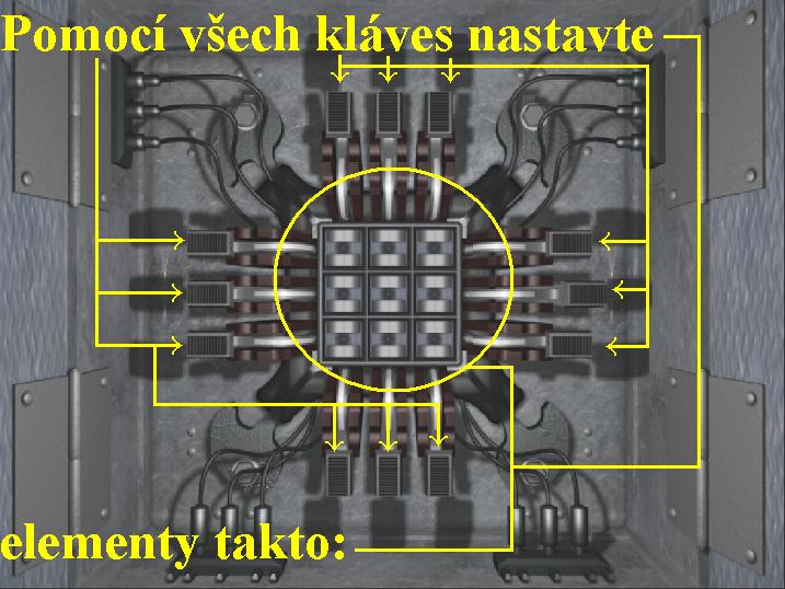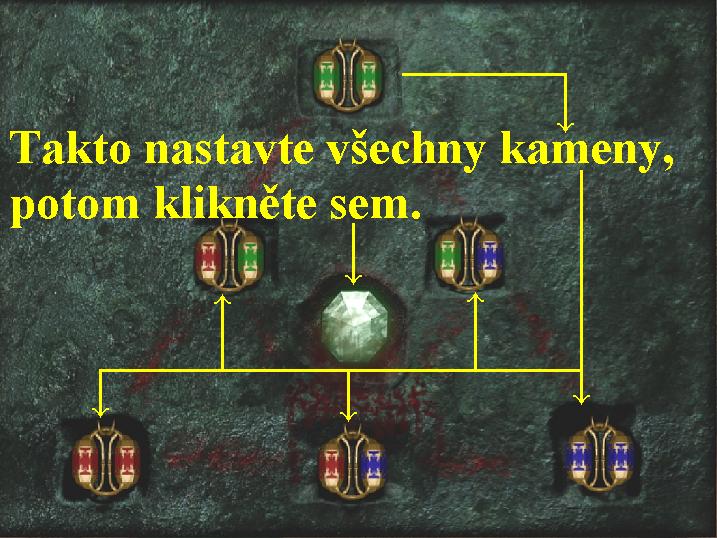 Jakmile se tedy ocitnete v reále, popojděte vpřed a na konci chodby aktivujte mříže v podlaze (D), tak se propadnete dolů, jistě jste poznali sami, že jste se ocitli na místě, kde Invar zjistil u žebříku, že jste v pořádku, tedy OK. Popisovat vám nyní cestu dál by bylo skutečně oním příslovečným „nošením dříví do lesa“ a navíc bych podceňovala inteligenci hráčů. Tedy jednoduše a prostě, nyní se musíte vám už velice dobře známou cestou dostat do známé kruhové místnosti se sloupy, v níž vám Invar zpřístupnil kouzlem cest k vratům. Takže se tam vydejte, cesta zůstala otevřená, jděte tedy k vratům a projděte jimi. Ocitli jste se už na taktéž dobře známém mostě, pod nímž protéká žhavá láva. Jděte vpřed, bestii již v minulé misi skolil Invar, takže můžete pokračovat dál přes protější vrata, za nimi pokračujte vpřed. Hned v první místnosti posbírejte ozdravné balíčky, pokračujte doleva a stále vpřed, projděte dveřmi. Vydejte se vpřed úzkou chodbou, odbočte doprava, poté doleva, na konci vylezte nahoru po žebříku. Ocitli jste s místnosti, plné kovových lávek, nejdříve se po nich projděte, tak naleznete ukládací místo, kde si hru uložte. Jděte po lávce doprava, odbočte znovu vpravo, tak dojdete ke sloupům, které jsou malou nápovědou pro vyřešení nového puzzle. Sloupy jsou postaveny tak, že vidíte dvojici zelených, potom zelený s modrým a poslední dva modré. Vracejte se po lávce zpět doleva, jděte vpřed a odbočte doleva, seběhněte dolů po malých schůdcích, zde se hra na chvíli jakoby přeruší, poté pokračujte vpřed, odbočte doleva, jděte vpřed, na konci vpravo přistupte k vratům, které jsou uzavřeny barevnými kameny. Aktivujte vrata, tak se vám objeví šest dvojic různobarevných kamenů, tvořících pomyslný trojúhelník. Pamětliví předcházející nápovědy tedy nastavte tedy kameny tak, že na špici trojúhelníku umístěte kámen zelený/zelený, pokračujte ve směru hodinových ručiček dolů dál, umístěte kámen zelený/modrý. Pokračujte dál, přemístěte kámen tak, aby další byl modrý/modrý, poté červený modrý, nato červený/červený a nakonec červený/zelený. Kameny přemisťujete tak, že na ten který hodláte přemístit aktivujete (D), kurzorovými klávesami se posunete na místo kam ho chcete přemístit a potvrdíte (D). Jakmile tedy tímto způsobem přemístíte na správná místa všechny kameny, kurzorovými klávesami se přesuňte na drahokam uprostřed a potvrďte (D)0000010150_n07.jpg (84933 bytes) (obr.7). Tak spatříte, že země se zachvěla a vrata se otevřou, jděte tedy vpřed a projděte jimi. Pokračujte vpřed, na konci vyběhněte po točitém kamenném schodišti až nahoru, kde projděte dveřmi. Ocitli jste se na vězeňském dvoře, zde zabočte doleva, popojděte vpřed, na zdi vlevo přehoďte páku, tak jste zapnuli reflektory, ale strážci z věžičky začnou po vás střílet. Střelbu neopětujte, je to zbytečné, ale utíkejte a kličkujte doleva, ať vás nezachytí reflektory, na konci odbočte doprava a vlevo vstupte do dveří. Zde jděte doleva, na konci chodby leží hromádka zbraní, ty ale neseberete, pokud byste se o to pokusili, bude vám sděleno, že tyto zbraně už má při sobě Demir. Vstupte tedy do posledních dveří vpravo, tak se v animaci setkáte s Demirem, pokecáte si, osvobodíte ho a společně vyběhněte zpět na vězeňský dvůr. Tak se spustí v animaci přestřelka, při níž bude těžce zraněna Ebru a Demir jednoho střelce z věžičky sestřelí. V reále zkuste Ebru oživit, ale nepůjde to a hra se uloží.