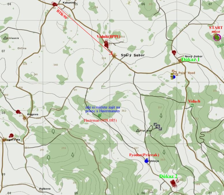 a směr je označen modrou šipkou, řekne vám o Dr. Sovovi, knězi Fjodorovi a že je tu 6 opěrných bodů, ale přesné místo neurčí.