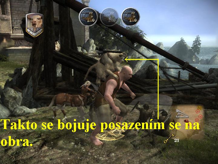 Ocitli jste se tedy zpět na nádvoří, přepněte se na Minotaura a zachytněte se za páku, jeden z dalších vašich kamarádů uchopí druhou, společně za ni zatáhněte, tak si otevřete vrata do další lokace. V této části se nacházejí celkem tři truhlice, bude dobré, než se pustíte do plnění nadcházejících úkolu, přepnout se na Minotaura a proběhnout se po celé lokaci, předem otevřít všechny truhlice, které se nacházejí po jedné u třech válečných strojů a posbírat i poházené klíče. Jakmile tedy splníte tento úkol, najděte si obra a jako Minotaurus si na něj nasedněte (přibližte se k němu a klikněte na klávesu F)0000010519_n01.jpg (72778 bytes) (obr.1). Nyní hledejte postupně tři válečné stroje, jejich znázornění máte nahoře na obrazovce. Jděte tedy k prvnímu z nich, nachází se uprostřed této lokace, naproti bráně, kterou jste sem přišli, z obra z něj nadělejte třísky, na obrazovce vám vybledla prostřední ikonka válečného stroje. Pokračujte doprava k velice chatrnému mostu, vstupte na něj, spustí se animace a vᚠobr se propadne do hlubiny. Nyní si počkejte, až se objeví druhý obr, jako Minataurus si na něj vyskočte, jděte k prvnímu obrovi a vytáhněte jej z propasti. Společně s ním potom svalte přes hlubinu obrovský plochý kámen, po něm přejděte k druhému válečnému stroji a i tento zlikvidujte. Nyní se vydejte k poslednímu válečnému stroji, který se nachází v této lokaci úplně na konci vlevo. Po cestě však obra napadnou nepřátelé, kteří jej spoutají do provazů, tyto nepřátele i s provazy zničte, pokračujte doleva a zničte poslední válečný stroj. Pokud jste je tedy zničili všechny, všechny tři ikonky těchto strojů na hrací ploše musejí vyblednout. Jestliže je tedy vše v pořádku, vrate se zpět na nádvoří.