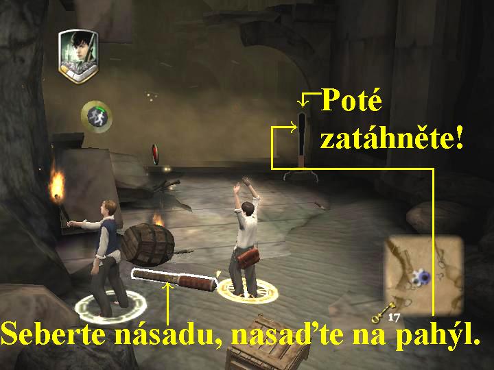 Ihned se přepněte na kozla a vyšplhejte si po laně výš, kde ubijte nepřátelského obra. Nyní se přepněte na Petra a vyhoďte lano, přelezte si za kozlem, přepněte se na kozla a rozbijte bariéru. Po laně se spuste dolů, zabijte dalšího nepřátelského obra, pokračujte dál a roztřískejte sudy. Použijte páku, otáčejte jí, pokračujte dál po takto vysunuté lávce a tím tady po skončení animace máte vše hotovo.