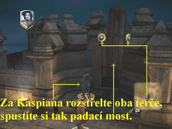 Po skončení animace se ocitnete v místnosti, ze které na první pohled není úniku. Rozsekejte tedy všechny sudy a bedýnky, tak naleznete ozubené kolo a násadu k otáčení, oboje uložte na předem označená místa. Přistupte k násadě, nyní připevněné na zdi a otáčejte jí, tak snížíte po pravé straně schodiště, po kterém vyběhněte nahoru k první věži. Přepněte se na Kaspiana, tedy na lučištníka a nad prvními dveřmi rozstřelte oba barevné terčíky, tak dveřmi můžete projít. Z obrazovky se dozvíte zprávu, že další dveře jsou zničeny. Této zprávy si nevšímejte a vydejte se doprava, kde se nalézá skryté schodiště. Přepněte se na trpaslíka, prolezte dál malým otvorem, postavte se na nášlapnou dlaždice a tak otevřete cestu i vašim kamarádům. Nyní tedy střídavě otáčejte násadou k otáčení a tahejte za páku, což několikrát po sobě zopakujte, to dělejte tak dlouho, dokud si neotevřete branku pro vstup do věže, projděte a otevřete první truhlici. Zatáhněte za páku, spustí se animace, po jejím skončení se vydejte vpřed. Zde otevřete druhou truhlici, přepněte se na Petra, hoďte kotvu a vyšplhejte se výš po laně, nahoře otevřete třetí truhlici. Nyní se vrate zpět k polorozpadlým dveřím, úplně je zničte a projděte jimi. Nyní budete muset likvidovat stráže, seberte násadu k otáčení a uložte ji na blikající ikonku otočného mechanizmu, opřete se do něj a otáčejte jím doprava, tak si vysunete mostík k další věži, pokračujte dál, přepněte se na lučištníka a rozstřelte terčík nad bránou. Pobijte zbrojnoše, nahoře na hrací ploše se vám objeví ubývajícího zvonu, což znamená, že nejdříve musíte zabít zbrojnoše, bijícího na zvon na poplach, pokud to nestihnete včas a ikonka ztemní, hra končí a můžete se o štěstí pokoušet znovu. Poté pokračujte rozbitou věží dál do vyššího poschodí, zde zlikvidujte další zbrojnoše, posbírejte několik střepů a otevřete truhlici. Sešlápněte na podlaze dlaždice ve výklencích, tak aktivujete terče nad dvěma mřížemi, rozstřelte je a za nimi najdete předměty, potřebné k opravě výtahu, tedy ozubené kolo a násadu k otáčení. Nasedněte ve vhodnou chvíli do výtahu, vyjedete tak k páce, za kterou zatáhněte, z výtahu v jeho dolní poloze vystupte, vysunuli jste si most k další věži, pokračujte tudíž dál. Přepněte se na Kaspiana a opět rozstřelte dva terčíky, jsou to držáky, které udržují padací most ve zvednuté poloze0000010519_n03.jpg (62799 bytes) (obr.3). Poté se přepněte na Petra, použijte na most hák a stáhněte si jej tak dolů, přejděte po něm na druhou stranu. Dojdete do následující věže, kde otevřete truhlici, stoupněte si na jednu z nášlapných dlaždic ve výklenku, kamarád si automaticky stoupne na druhou, otevřete si tak bránu a můžete přes ni vstoupit do další lokace. Ocitli jste se na věžním ambitu, najděte násadu k páce, nasaďte ji na pahýl a za páku zatáhněte, otevřeli jste si průchod, kterým projděte. Zde se po zemi povaluje několik dlaždic, které musíte postupně posbírat a vložit je do mozaiky dole na podlaze. Je to trochu obtížnější hlavolam, ale i ten při troše trpělivosti určitě zvládnete. Jakmile se vám i toto podaří, postavte se na některou z dlaždic, které jste před chvílí do mozaiky vložili, někdo z vašich kamarádů si automaticky stoupne na druhou, otevřeli jste si nový průchod, ještě než jim projdete otevřete další truhlu a teprve potom průchodem projděte.