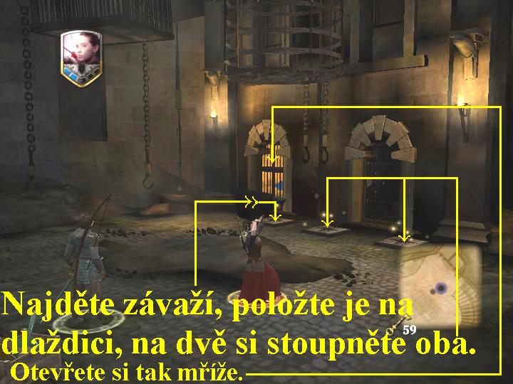 Přepněte se na Petra a použijte kotvu k násilnému vyvrácení vrat. Poté seběhněte dolů po schodišti, všimněte si obrovské klece a terčíku pro lučištníka, zatím s nimi ale nic nedělejte. Přejděte do levé části místnosti, sešlápněte dlaždice a v takto zpřístupněném výklenku vysbírejte klíče a střepiny, poté otevřete truhlici. Nyní seberte ze země šestikilové závaží, přejděte i s ním do pravé části místnosti, kde je položte na jednu z nášlapných dlaždic. Jde to velice ztuha, i zde musíte být hodně trpěliví, ale určitě i tuto velice nepříjemnou záležitost při troše tréninku, tedy pokusech zvládnete, ono je to trochu obtížné najít to správné místo k odhození závaží. Jakmile se vám to ale podaří, stoupněte si na jinou dlaždice, vᚠspolečník si automaticky stoupne na poslední a tak nadzvednete mříže od druhého výklenku, vyberte i předměty v něm se nacházející0000010519_n04.jpg (74741 bytes) (obr.4). Nastal čas, abyste sestřelili z luku terčík, u obrovské klece, spustí se animace, v níž se objeví obr, kterého v reále nalákejte do klece a sami rychle utečte, tak klec spadne a obra uvězní. Zároveň se vám zpřístupní dveře do vedlejší místnosti, projděte tedy jimi, zde se nacházejí už dva obři. Rychle si stoupněte před klec na jakýsi podstavec, jakmile se k vám obr rozběhne, opět rychle uhněte, tak klec spadne a uvězní obra. Tu stejnou past a stejným způsobem připravte i druhému obrovi, tak uvězníte v druhé kleci i jeho. Nyní je tady již zcela bezpečno, takže si v klidu prohlédněte celou místnost, porozbíjejte vše co lze, posbírejte střepiny a doplňte si tak zdraví. Poté se vydejte do pravé části této místnosti, kde sestřelte z luku terčík, tak se vám otevře výklenek, ve kterém zatáhněte za páku. Z animace zjistíte, že spadne na podlahu obrovský lustr a z něj vypadne násada k otáčení. V reále ji tedy seberte, odejděte s ní do levé části místnosti, kde v rožku ji nasaďte na vyznačené místo, otáčejte s ní, tak si otevřete další výklenek, jděte tam, otevřete truhlici a seberte násadu na páku. S pákou se potom vydejte do vedlejší místnosti, kde ji nasaďte na pahýl páky, poté za páku zatáhněte. Totéž potom učiňte s druhou pákou v levé části místnosti, poté co za ni zatáhnete, tak posunete klece s uvězněnými obry o kus dopředu a tyto zatíží dlaždice v podlaze, tak si zpřístupníte cestu pro další pokračování. Ještě než však se rozhodnete pokračovat dál, v pravé části místnosti použijte řetězy otevřít poslední výklenek, v němž otevřete další truhlici. Nyní tedy již můžete projít dál a ocitnete se u veliké klece, v níž je uvězněn profesor Kornélius. Zde musíte nechat obry nabíhat na sebe a včas uhýbat tak, aby tito nárazem do nich zlikvidovaly všechny čtyři sloupy. Je to sice podivné, že klec stojí stále by jen na jedné noze, ale je to tak. Teprve poté, co obři svými kebulemi srazí poslední sloup, klec spadne, rozbije se, zabije obry a profesor Kornélius je na svobodě. Nyní se tedy opět vrate na známou křižovatku, jděte dlouhou chodbou dopředu, tak se spustí animace, v níž spatříte Zuzku, jak z úkrytu pozoruje dva těžkooděnce. V reále se přepněte na trpaslíka a vlezte do nově vzniklého malého otvoru. Profesor vám tedy v animaci chemicky zlikvidoval ba nebezpečné těžkooděnce, takže cesta vpřed je volná.