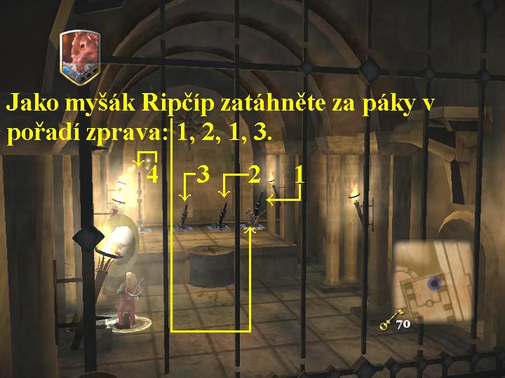 Po skončení animace se všichni ocitnete na malém nádvoří před hradem, kde vás budou napadat neustále houfy žoldnéřů. Je tedy nutné pustit se do boje a zlikvidovat první houfec nepřátel, poté využít chvíle, než nastoupí druhá vlna útočníků, přepněte se na trpaslíka a utíkejte doleva, kde prolezte malou dírou, nahoře otevřete první truhlici, poté se vrate dolů. Druhá truhla je o kousek dál vpravo, samozřejmě i tuto otevřete. Přepněte se na Petra a použijte kotvu na ikonkou označený předmět, tak jste si zpřístupnili schodiště a zároveň otevřeli cestu do další lokace. Vyběhněte tedy po tomto schodišti nahoru a projděte dveřmi, v animaci vás myšák Ripčíp ujistí, že se splnění úkolu ujme s trpaslíkem sám, v reále se tedy ocitnete nahoře na ambitu u páky. Zde se raději přepněte na Ripčípa, nebo trpaslík není žádný udatný bojovník, zatáhněte za páku a tak si z podlahy vysunete schodiště. Pobíjejte žoldáky a utíkejte doprava, zde se přepněte na trpaslíka a kotvou si přitáhněte k sobě můstek. Přeběhněte po něm na druhou stranu, tak doběhnete ke staré bráně, zde se přepněte na myšáka a opakujte nápovědu klávesami, jak vám napovídá hra, tak myšák proleze a bránu vám otevře. Pokračujte vpřed a jako trpaslík se protáhněte malou dírou, poté si pomocí kotvy přitáhněte další most. Postavte se na dlaždice v podlaze, tak si vysunete plošinky v horním poschodí. Prolezte opět malou dírou a otevřete truhlu, vydejte se nahoru a přepněte se na myšáka, znovu opakujte klikání na klávesy podle nápovědy, nahoře vlevo přeskočte na lustr, ten i s vámi spadne a zpřístupníte si dveře. Prolezte do místnosti s pákami, pobijte zde všechny zbrojnoše, otevřete další truhlu, jednu postavu postavte na kruh v podlaze, s druhou postavičkou našlápněte na dlaždici a kruhový panel ji vyveze k pákám. Nyní za páky zatáhněte v tomto pořadí zprava: 1, 2, 1, 3, zpřístupnili jste si cestu pro další pokračování0000010519_n05.jpg (66350 bytes) (obr.5). Prolezte dírou zpět, probijte se bránou, pokračujte vpřed, tak dojdete k nově zpřístupněné malé díře, kterou se protáhněte. Seběhněte dolů, hákem si přitáhněte další můstek, vejděte do místnosti, plné žoldnéřů. Pobijte je do jednoho, porozbíjejte všechno harampádí, vydejte se na balkón, kde otevřete další truhlu. Na schůdcích po levé straně se nalézá ozubené kolo, které uložte do mechanizmu uprostřed místnosti, poté šlápněte postupně na dvě dlaždice. Jedna z nich je ze nalézá pod hromadou bedýnek, které musíte nejdříve porozbíjet, druhá je ukrytá za rohem vzadu vpravo. Teď jste si vysunuli další plošinky, přepněte se na myšáka, respektujte nápovědu a tak vyskáčete nahoru, kde shoďte klec vlevo. Tato spadne dolů a rozbije se, z ní vypadne druhé ozubené kolo, které taktéž seberte a vložte jej rovněž do mechanizmu na podlaze. Poté začněte otáčet pákou mechanizmu, počkejte až se spustí animace, po ní zlikvidujte žoldáky, pokračujte stále dál v otáčení tak dlouho, dokud se nespustí další animace, tak tuto část ukončíte a ocitnete se zpět ve výchozí místnosti.