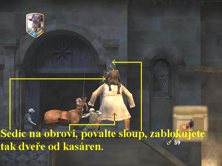 Po skončení animace se ocitnete na nádvoří, rychle otevřete truhlici, puste se boje s nepřáteli. Přepněte se na kentaura a pobíjejte žoldáky u obou závaží, kteří se snaží přeseknout lana. Zde musíte vydržet bojovat tak dlouho, dokud se v animaci nepřiblíží obr. Naskočte si za Minotaura na obra, roztřískejte barikádu, seskočte z něj a oběhněte nádvoří, kde pozotvírejte všechny truhlice, poté si znovu vylezte na záda obrovi. Nyní musíte vyjít na jedno ze schodiš a povalit nahoře podpěrný sloup u vchodu, tím zabarikádujete vstup do kasáren0000010519_n06.jpg (53878 bytes) (obr.6) a tak zamezíte dalším zbrojnošům vnikat na nádvoří. Seběhněte opět dolů, vydejte se na obrovi ke druhému schodiště, i nad ním nahoře povalte opěrný sloup, tak jste zabarikádovali druhý vchod do kasáren a další noví zbrojnoši se už nemohou na nádvoří dostávat. Seběhněte opět dolů, chvíli bojujte úspěšně s nepřáteli, tak se po chvíli spustí nová animace, v níž spatříte Petra, jak na vás mává a vyzývá vás, abyste se vydali k němu. Stále na obrovi se tudíž vydejte ke tmavému schodišti, obra však budou spoutávat nepřátelé pevnými lany, tyto darebáky bez milosti pobijte a obra uvolněte. Postupujte na obrovi stále ke zmíněnému schodišti, tak se spustí animace a také zároveň zakončíte tuto část.