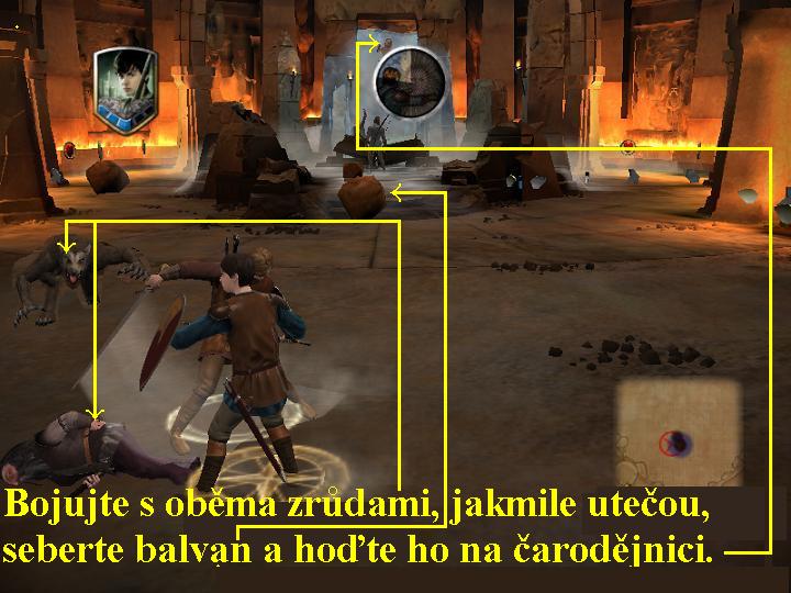Zde se nachází truhlice, příležitostně mezi útoky Vlkodlaka a Nikabrika ji otevřete. Nyní se budete tedy muset zbavit obou jmenovaných, přičemž kdykoliv odrazíte útok Vlkodlaka a tento se vzdálí, bude ze stropu padat kamení, tak pozor, a vám nespadne na kebuli. Takže se přepněte na Edmunda, jen on umí házet kamením, seberte mezi útoky obou nepřátel jeden z balvanů, spadnuvších ze stropu, jděte ke kamenným schůdkům a hoďte jej po čarodějnici0000010519_n07.jpg (72858 bytes) (obr.7). Toto je nutné provést úspěšně třikrát po sobě, tak se spustí animace a musíte pokračovat v boji. Pokud jste tak již neučinili, musíte se nejdříve zbavit Vlkodlaka a Nikabrika, je to dost obtížné, ale skutečně to jde. Čarodějnice však poté začne po vás házet ohnivými koulemi, kterým se musíte vyhýbat, i toto jde velice ztuha a možná si to budete muset zopakovat několikráte po sobě, jen neztrácejte trpělivost. Její zásahy jsou velice přesné a mají velice nebezpečný účinek, stačí dva, či tři a jste vzhůru bradou. Opět po ní házejte balvany a to tak dlouho, dokud se jí v další, velice hezké a výmluvné animaci zcela nezbavíte, tak se poté ocitnete znovu nazpět ve strži.