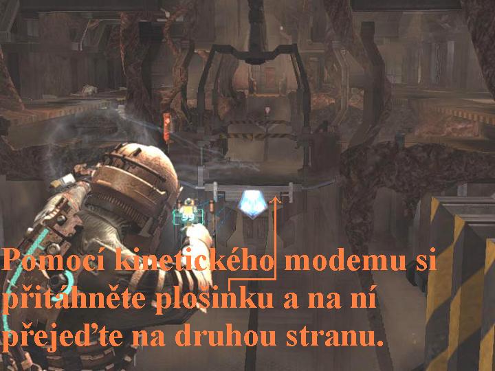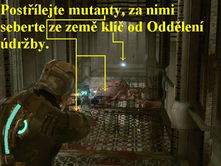 Otočte se, popojděte vpřed, uslyšíte poslední blouznivá slova umírající dívky, seberte u ní kinetický modem. Kolem dívky pokračujte do chodby, bedny si odstraňte pomocí kinetického modemu (F+pravé tlačítko myši), na konci chodby projděte dveřmi. Zde obdržíte novou zprávu a zároveň i úkol, zničit barikádu a získat RIG kapitána Benjamina Mathiuse, napřed ale musíte najít výbušninu TERMIT a defibrilátor. Projděte tedy dveřmi Výzkumné křídlo, seběhněte dolů po schodišti a pokračujte doleva, na další dveře použijte zpomalovač předmětů (C+pravé tlačítko myši), poté projděte dveřmi Hlavní laboratoř, za nimi skolte několik bestií. Ze skříňky označené písmenem C si doplňte plazmovou energii, poté vstupte na nákladní výtah, aktivujte jeho panel, tak sjedete níž, kde ihned pobijte několik mutantů. Na panelu si doplňte stázi, dveřmi vstupte do malé místnosti, kde vyberte skříňky (lze otevřít pouze ty, označené modrým světélkem). Projděte dvěma dveřmi Biologická laboratoř, na konci chodby spatříte za sklem člověka, kterého právě zabíjejí bestie, tomu už nepomůžete, dokud ho neusmrtí, ani se dál nedostanete. Jakmile tedy člověk zemře, vstupte zleva dveřmi do laboratoře, pobijte vražedné bestie, v místnosti se ve vitrínách nacházejí lidská embrya v živném roztoku. Jděte vpřed, nastupte si na další nákladní výtah, aktivujte jeho panel, tak vyjedete výš. Zlikvidujte několik monster, projděte protějšími dveřmi, poté druhými, zajistěte energetický uzel, ze stolku seberte výbušninu TERMIT. Poté co obdržíte další nové pokyny, je vaším úkolem nalézt defibrilátor, projděte tedy dveřmi do Hlavní laboratoře, nato dalšími do Bezpečnostní stanice, odtud pak pokračujte dál dveřmi PTG Křídlo, vydejte se lomenou chodbou vpřed. Narazíte na téměř již zmutovaného umírajícího člověka, ani jemu již není pomoci, pokračujte dál dveřmi vlevo do RTG Sál. Zde si z databáze přečtěte lékařskou zprávu, aktivujte energetický uzel, tak si zpřístupníte další dveře. Za nimi se nachází místnost, kde opět vyberte skříňky, můžete si opravit vaše uzlová spojení, tedy vylepšit si vlastnosti i vybavení na panelu, označeném jako LAVICE, seberte i deskový polovodič ze stolku. Pokračujte vpřed, tak přijdete k znetvořené mrtvole v obrovské trubici, tuto trubici si posuňte stranou pomocí kinetického modemu, jděte vpřed a postřílejte další mutanty. Projděte dveřmi, narazíte na umírajícího člověka, ani tomu již nelze pomoci, za ním však seberte pulzní schéma, aktivujte skříňku s energetickým uzlem. Nyní se vydejte k nákladnímu výtahu, ale ten nefunguje. Pomocí kinetického modemu zvedněte opodál ležící energetický blok a zasuňte ho do otvoru ve stěně. Nyní již je výtah funkční, nastupte si na něj, aktivujte panel, tak vyjedete výš. Použijte kinetickou energii na panel GRIP, tak ho odsunete a zleva ho obejděte a jděte vpřed, na panelu na zdi si obnovte stáze. Posuňte panel GRIP zpět, jděte ke dveřím, vpravo od nich rozstřelte panel, tak si dveře zpřístupníte a tudíž jimi projděte, hned poté druhými do Zóny bezgravitační terapie. Vyberte skříňky a projděte dveřmi, pozor, ocitli jste se ve vzduchoprázdnu, takže pracujte rychle a sledujte vaše zásoby kyslíku, ať se neudusíte. Nyní se vám aktivují vaše gravitační boty, projděte dveřmi ven, aktivujte panel, poté se zaměřte na protější dveře, respektive na plošinku pod nimi (pravé tlačítko myši) a přeskočte si k protějším dveřím na plošinku pod nimi (levý Ctrl), několika dalšími přeskoky se dostanete až ke dveřím, jen podotýkám, že usměrňovat vaše „cestování“ v beztížném stavu je poměrně dosti obtížné. Pomocí kinetické energie si přitáhněte z prostoru před vámi energetický blok a zasuňte jej do otvoru vpravo ode dveří, teď tedy již dveřmi můžete projít. Vyberte skříňky a ze stolku seberte defibrilátor, obdrželi jste nový úkol zničit barikádu. Vraťte se tedy dveřmi zpět, pobijte objevivší se mutanty a stejným způsobem se přeneste nazpět k vstupním dveřím. Projděte jimi, na konci vpravo druhými, zabočte doprava, zabijte mutanta, pokračujte vpřed a projděte dveřmi do RTG Sálu, vstupte do chodby a na panelu na zdi vpravo si hru rozhodně uložte, určitě byste si nechtěli vaše cestování v beztížném stavu znovu zopakovat. Pokračujte chodbou dopředu, zabočte doleva a kinetickým modulem si přitáhněte k sobě podlážku s cedulí GRIP, poté ji obejděte, zbavte se mutantů a jděte k výtahu, na něm aktivujte panel, tak sjedete níž. Zbavte se dalších mutantů, pokračujte chodbou vpřed, dveřmi vlevo se vracejte do bezpečnostní stanice. Pozabíjejte mutanty, doplňte si stáze, pokračujte dopředu lomenou chodbou, na jejím konci projděte do dveří vpravo s názvem Bezpečnostní stanice. Na zvýrazněné místo před vámi uložte nálož TERMIT, ta automaticky vybuchne, obdržíte další zprávu a nový úkol, získat RIG od mrtvého kapitána Benjamina Mathiuse. Projděte dál nyní již zpřístupněnými dveřmi s názvem Nemocnice lodi Ishimura, přečtěte si videozáznam, z nějž k vám pohovoří Nicolle, vaši přátele jsou tudíž přesvědčeni, že se nachází někde poblíž a je živá. Pokračujte chodbou vpřed, vstupte do dveří se stejným názvem, poté projděte dveřmi vpravo na Pohotovost, v místnosti pobijte několik malých zmutovaných bestií. Ze země seberte pomocí kinetického modemu energetický blok a zasuňte ho do otvoru vpravo ode dveří Chodba pohotovosti A. Zde postřílejte další zmutované bestie, vpravo po aktivaci energetického uzlu můžete projít dveřmi do malé místnosti, kde vyberte skříňky a získáte tak něja