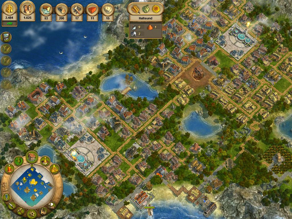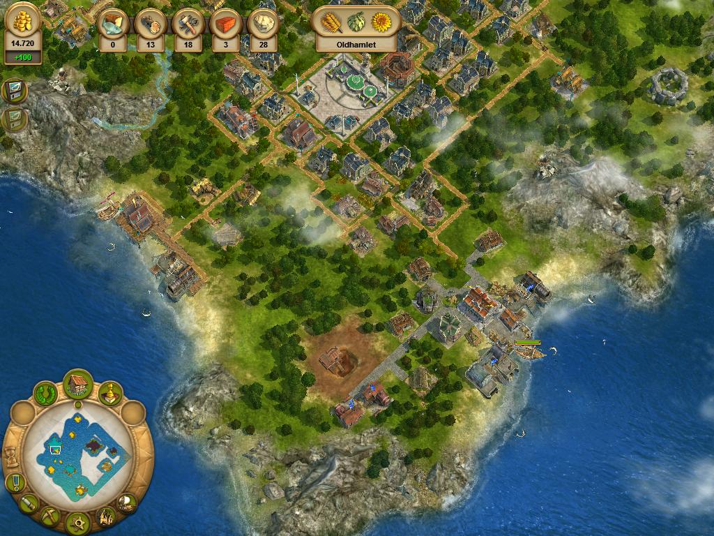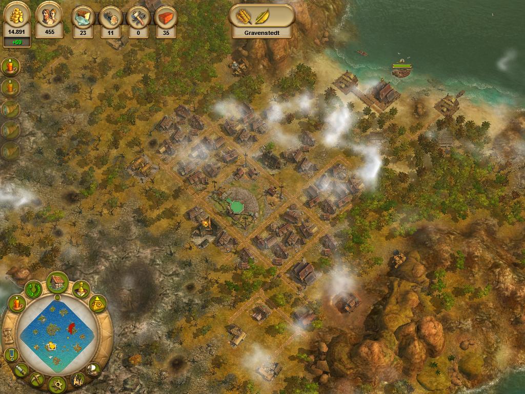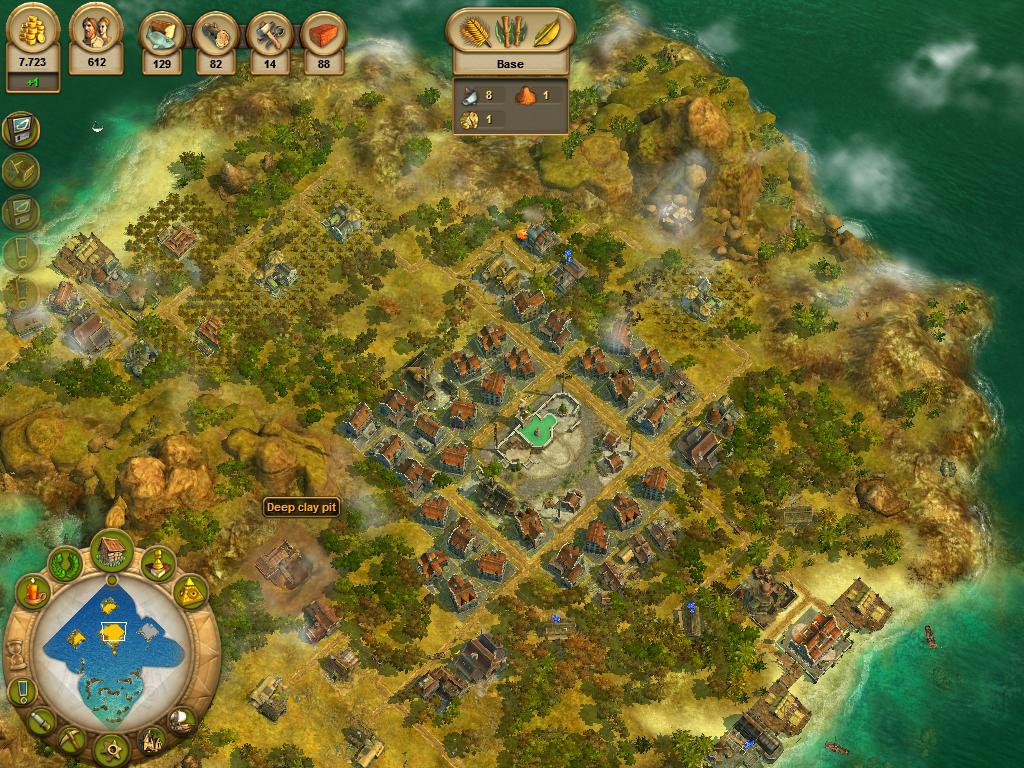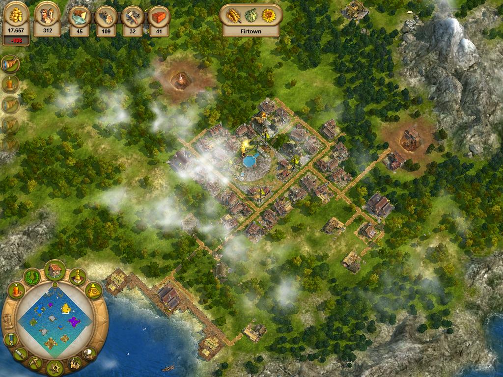 na západě objevíme ostrov s obětitěm, do kterého se má dát olej. Tenhle úkol zatím vynecháme a snaíme se dostat osadu na úroveň,