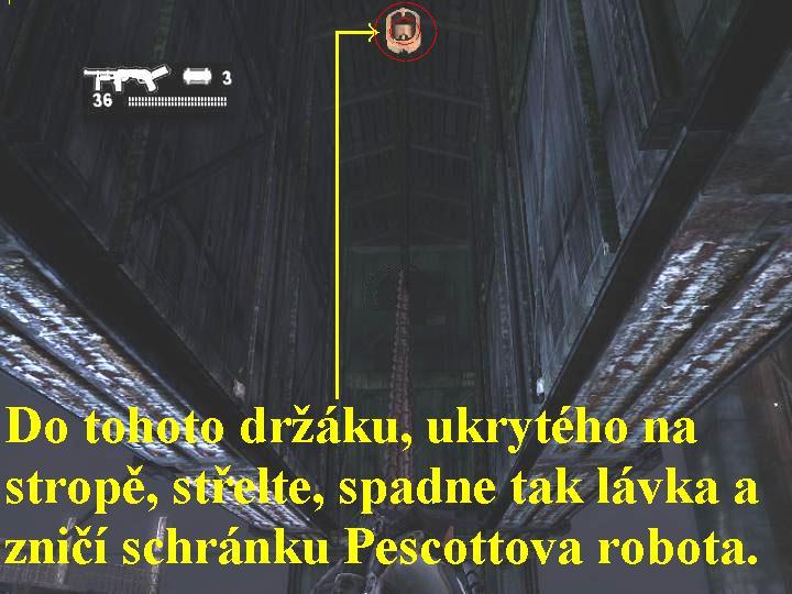 rampu, zde vás robot z kulometů nezasáhne, vlevo se odrazte od stěny a naskočte