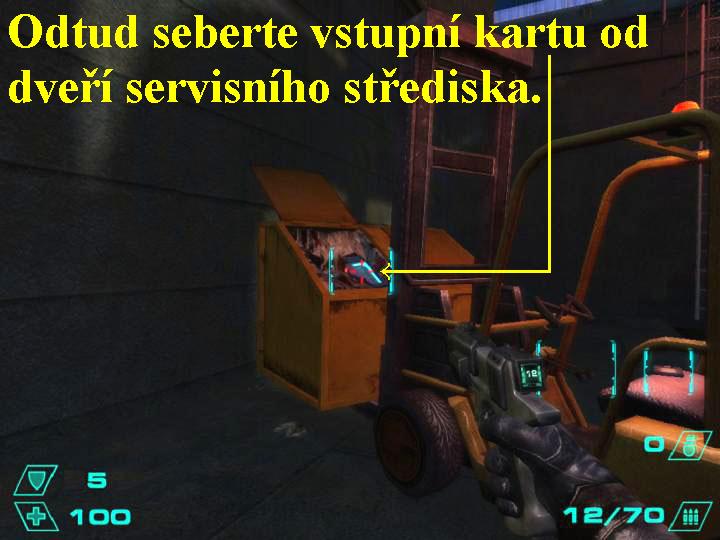 Společnost tedy přijala vysoká a podle ní i velice účinná bezpečnostní opatření, abyste z jejich prostor nemohli uniknout. Budete tedy muset nalézt a použít obrněné auto, neboť bez něj je únik s prostor společnosti naprosto nemožný. Vyjděte tedy ven na rampu, zabočte doprava, seběhněte dolů po schodišti, zabočte doleva a na konci si slezte do vody. Nyní umíte i plavat a potápět se, jen si dejte pozor, ať vám v plících nedojde vzduch, ukazatel množství vzduchu máte na hrací ploše vlevo dole. Plavte tedy doleva až k přepážce ve vodě, vyskočte si na ni a z ní si přeskočte doprava na stavební lešení. Pokud se po něm projdete, zjistíte, že se na něm nacházejí dva panely s pákami, těmito lze ovládat dva mini výtahy na protější straně. Na obou panelech přehoďte páky s příkazem „dolů“, tak oba výtahy naproti sjedou o patro níž. Skočte nazpět do vody a plavte na druhou stranu mírně doleva k protějšímu lešení až k překážce ve vodě, vylezte na ní, přeskočte si na bloky a z nich na lešení, po žebři vylezte o patro výš. Otočte se doprava a po stavebním lešení si vždy s rozběhem přeskakujte zleva doprava a naopak stále vpřed, na předposledním lešení sestřelte bednu, přeskočte na poslední, kde seberte bezpečnostní kartu0000011208_n05.jpg (80107 bytes) (obr.5). Seskočte zpět do vody, plavte doleva k plošince, vystoupejte po ní z vody a zabočte doprava, jděte vpřed a na konci si vylezte nahoru po žebříku. V chodbě odbočte doprava a na panelu na konci použijte bezpečnostní kartu. Tak můžete projít dveřmi, hned poté druhými do chodby, na konci chodby vpravo si vylezte nahoru po žebříku do další chodby. Jděte k vysokozdvižnému vozíku, zatáhněte za jeho páku uvnitř, tak jeho vidlice pootevřou roletová vrata před vámi. Skrčte se (C) a podlezte pod nimi, tak se ocitnete v garáži u obrněného auta. Protější dveře jsou však zablokovány stejně tak, jako panel v přízemí před vámi vpravo. Vpravo po žebříku si tedy vylezte nahoru po lešení, po druhém žebři ještě výš, otočte se doleva, jděte vpřed a na konci na panelu přehoďte páku, teď jste si otevřeli dole roletová vrata před vaším obrněným vozidlem. Slezte tedy opatrně dolů, nasedněte do obrněnce a nyní už můžete vraty, která jste si před chvílí otevřeli, projet ven. Jeďte tedy dopředu, zatočte doprava, ze střelecké věžičky vašeho obrněnce likvidujte živou sílu vašich nepřátel, zlikvidujte i velice odolné roboty. Prostřílejte si cestu až k dalším vratům a pokud je již kolem vás bezpečno, vystupte si z obrněnce, dejte se uličkou doprava, na jejím konci vstupte dveřmi vlevo do místnosti. Zde aktivujte poslední monitor vpravo, tak si otevřete bránu, před kterou jste s vaším obrněncem zůstali stát. Vraťte se tedy k vašemu vozidlu, bude už zřejmě hodně poškozené a na pokraji jeho životnosti (ukazatel jeho stavu máte rovněž dole na obrazovce), vstupte pěšky do brány, kterou jste si před chvílí otevřeli, tak se spustí animace a po jejím skončení v reálu zlikvidujte v místnosti všechen odpor, včetně automatických střeleckých věžiček. Poté dojděte až na konec místnosti, kde aktivujte panel, otevřete si tak další vrata, kterými projděte.