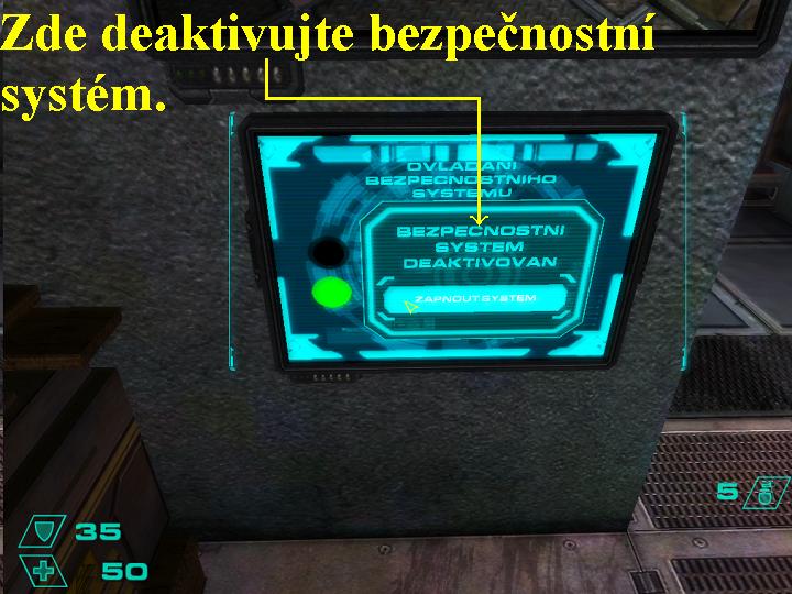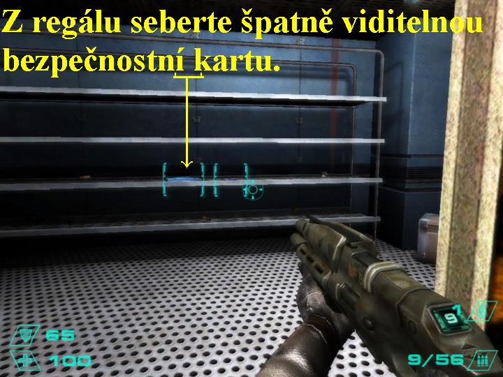 Nyní jste se ocitnuli v chodbě a dozvíte se, že všechny dveře s modrými kontrolními světélky byly zablokovány, protože jsou vybaveny identifikačními systémy, budete tudíž muset najít způsob, jak je otevřít. Pokračujte tedy chodbou vpřed, po prvním vašem výstřelu se spustí poplach. Ze všech dveří budete napadeni nepřáteli, dveřmi vlevo sice projdete, ale druhé za nimi jsou zablokovány, vraťte se tedy a vstupte do dveří vedle nich, to je záchod, takže odbočte doprava a vstupte do dveří vpravo. Zde vyběhněte po schodištích až nahoru, ale i zde jsou dveře nahoře za matnou clonou nepřístupné, ale sem se ještě vrátíte. Vraťte se tudíž zpět do chodby a vstupte do protějších dveří do místnosti, ve které stojí na zdviži obrněný vůz. Na panelu dejte příkaz k jeho nadzvednutí, poté vlevo slezte dolů po žebříku, dejte se doprava, kde seberte jednu z beden a přeneste ji na druhou stranu doprava, kde ji položte na zem. Z ní pak přeskočte na protější rampu, dejte se vpravo a vlevo vstupte dveřmi do chodby. Z ní potom odbočte do prvních dveří vpravo a po schodišti si vyběhněte až nahoru, kde vstupte do další chodby protějšími dveřmi. Prostřílejte si cestu až na konec chodby, kde projděte do další chodby dveřmi vlevo. Na konci chodby projděte dveřmi a vpravo na zdi přehoďte páku, tak si zapojíte doposud vypnutý elektrický proud0000011208_n06.jpg (67205 bytes) (obr.6). Vraťte se do chodby a prvními dveřmi vpravo seběhněte dolů po schodišti, projděte zábranou, odbočte doprava, počkejte, až nepřátelé rozstřílí dřevěné dveře, pokud se tak nestane, rozstřílejte je sami. Popojděte vpřed, dveřmi projděte do místnosti vpravo, jste v místnosti, kde se nachází skener. Aktivujte ho a nyní máte pouhých pět sekund na to, abyste panel skeneru zprava oběhli a hned zatočili doleva k oku kamery, tak budete v animaci naskenováni. Nyní se znovu vraťte vám již dobře známou cestou k prvnímu schodišti, na které jsem vás upozornila před chvílí, znovu po něm vyběhněte až nahoru, teď již dveřmi za clonou projdete. Za nimi pak odbočte doprava a vstupte posledními dveřmi do místnosti, kde seberte bezpečnostní kartu. Poté se vraťte na chodbu, odbočte vlevo a na panel vpravo na zdi ji použijte, přes dveře, které jste si takto otevřeli, vstupte do místnosti. Na jejím konci si aktivací panelu otevřete další dveře, vstupte přes ně do chodby, na panelu na konci si přivolejte výtah. Nastupte si do výtahu, na panelu v kabině dejte příkaz k jízdě dolů, jakmile dole výtah zastaví, vystupte si a projděte protějšími dveřmi do místnosti. Jděte k vratům a pomocí panelu si je otevřete, vstupte do další místnosti, jděte do „kukaně“ a i zde uvnitř aktivujte panel.