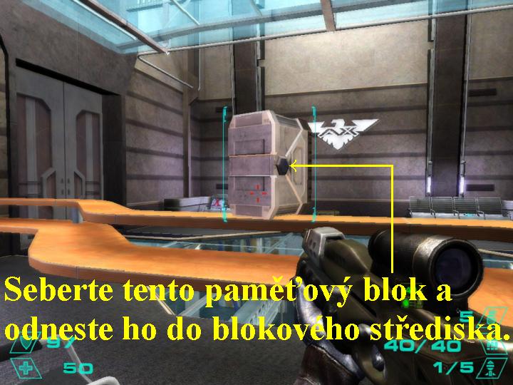 Projděte dveřmi, poté druhými, v animaci se setkáte s Mikem, který vám sdělí, že konečně nastal čas, abyste s konečnou platností opustili místnosti společnosti. Otevřou se však dveře a vystoupivší strážci na Mika vystřelí a smrtelně ho zraní. Umírající Mike vám ještě stačí sdělit několik informací, ale poté zemře. V reálu si tedy nyní budete muset poradit sami, projděte proto dveřmi, v místnosti odbočte doleva, poté doprava a projděte dveřmi vlevo. V místnosti si prostřílejte cestu k protějším dveřím, projděte jimi, v chodbě zabočte doleva a projděte dveřmi vlevo. V místnosti dole pod schůdky je nějaká munice, vy si však prostřílejte cestu po schodištích až úplně nahoru, vstupte do místnosti přes protější dveře, poté do místnosti dveřmi vlevo, kde ze stolku seberte (E) paměťový blok0000011208_n04.jpg (75731 bytes) (obr.4). Ten tedy budete muset odnést až na patřičné místo, před každými dveřmi ho položte na zem, projděte dveřmi, postřílejte strážce, vraťte se pro blok, uchopte ho do náruče a pokračujte takto stále dál. Ještě v druhé místnosti za druhými dveřmi od záchodu jsou strážným hlídané nějaké užitečné předměty, poté i s blokem projděte prvními dveřmi vpravo a sneste jej v náručí po schodištích, kterými jste sem přišli, až do přízemí, kde projděte dveřmi, hned poté druhými. Zabočte doprava, poté doleva, vstupte do místnosti blokového střediska a s blokem v náručí obcházejte všechny ostatní bloky. Místo, kam jej máte uložit, není nikterak označeno, ale jakmile projdete kolem správného bloku, váš blok zapadne na patřičné místo sám, zcela automaticky. Nyní se vracejte stejnou cestou zpět, prostřílejte si cestu přes schodiště nahoru až do místnosti, ve které jste sebrali paměťový blok. Z místnosti projděte dál nyní již zpřístupněnými dveřmi do místnosti, kterou jistě poznáváte, zde jste přece začínali. Poté co místnost vyčistíte, vstupte do druhých dveří vpravo, projděte chodbou a hned nato druhými dveřmi.
