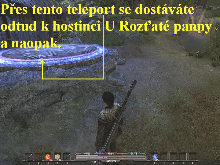 Získáváte první výstroj a výzbroj, hoří ve vás touha pomstít se proradnému králi Rhobardovi III. Diego má nápad, máte nalézt chrám s posvátnou kovárnou, kterou hodlají Rhobardovi Paladinové obsadit a využít ji k výrobě zbraní, které potřebují pro tažení proti Argaanu. Musíte tedy chrám najít dříve, než se jim to podaří uskutečnit a využít kovárnu ve vᚠprospěch. Podrobnosti o tomto plánu by vám mohl sdělit mág Daranis, který pobývá v hostinci U Rozaté panny, nedaleko pláže, kde se nacházíte. Jděte tedy vpřed, zprava vás napadnou válečníci Hmyzořroutů. Které pobijte a mrtvoly prohledejte (E), (tak prohledávejte všechny zabité nepřátele, nebudu vás už na tuto nutnost dále upozorňovat), pokračujte vpřed a na konci odbočte doleva k hostinci. Promluvte si s Genearem, proberte s ním všechny možnosti dialogů, poví vám, kde najdete Daranise. Vstupte tedy až do lokálu, kde si promluvte s hostinskou jménem Murdra, proberte i s ní všechny nabídky dialogů, můžete si i v jejím obchodě nakoupit, co uznáte, pokud ovšem máte peníze. Od ní se mimo jiné dozvíte, že Daranis je u ní ubytován, vyjděte tedy po schodišti nahoru a vejděte na balkón, odbočte vpravo a vstupte do dveří, v pokoji si promluvte s Daranisem. Poví vám, že v archívu ve Stříbrovodské pevnosti byste mohli najít nějaké cenné informace, je zde však problém, cestu okupují bandité, takže je budete muset později nějakým způsobem zlikvidovat. Dozvíte se od něj také, že několik místních obyvatel připravuje jakési plány, jak se těchto padouchů zbavit. Sejděte dolů a znovu si promluvte s Murdrou, má nápad, doneste jí od Garva dva soudky medoviny. Vyjděte tedy z hostince ven, vydejte se po cestě dolů, odbočte doprava a kolem teleportu pokračujte vpřed, ten je zatím nefunkční. Projděte kolem dívky jménem Jilvie, tak dojdete k bráně, kterou hlídají dva strážci, ale tudy dál zatím neprojdete. Vydejte se tedy na jihovýchod na pláž, prohledejte obě chatrče, pohovořte se rybářkami, v chatrčích posbírejte vše užitečné, prohledejte celou pláž, v bedně je zlato. Poté vstupte do teleportu a objevíte se nazpět kousek od hostince, tím jste oba teleporty zprovoznili a nyní je tedy můžete používat pro rychlý přesun mezi oběma lokacemi (obr.1). Pokračujte po pláži na východ až na místo, kde jste přistáli s Diegem, pokračujte dál hustým porostem, pobíjejte Gobliny a Krvavé mouchy. Jděte stále vpřed, vpravo vidíte hrad, zatím tam nechoďte, jděte vpřed a narazíte na Garva, promluvte si s ním a požádejte ho o dva soudky medoviny. Bude chtít za ně 200 zlatých, nedávejte mu je, přijměte souboj s jeho kumpány, porazte je a dostanete soudky s medovinou zcela zadarmo. Známou cestou se vrate nazpět k hostinci U Rozaté panny (můžete použít i teleport u rybářských chatrčí), vstupte do hostince a znovu si promluvte s Murdrou, soudky s medovinou ji předejte. Proberte s ní všechny možnosti dialogů, tak zjistíte, že po vás chce, abyste zašli do starého dolu na západní straně Prasečího kamene od hostince U Rozaté panny a donesli jí tři hřiby železňáky.