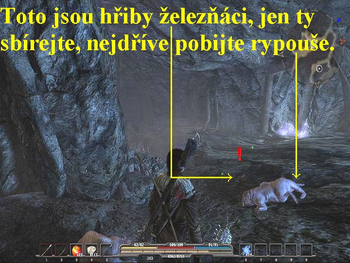 Hostinská Murdra tedy chce, abyste jí od Garva přinesli tři hřiby železňáky, vyjděte tedy z hospody a jděte na jih, zbavte se Polního škůdce a po chvíli odbočte doleva. Prodírejte se houštím a likvidujte Gobliny a ostatní bestie, tak dojdete na cestičku, která vede k domečku Garva, po cestě si všimněte hradu vpravo, ale zatím tam nechoďte, jen si místo zapamatujte, později se tam budete muset stejně vydat. Promluvte si s Garvou, požádejte ho o dva soudky medoviny, bude za ně požadovat dvě sta zlatých. Nic mu nedávejte a přijměte boj s jeho kumpány, jakmile je porazíte v souboji, Garva vám dá dva soudky medoviny zadarmo. Jakmile tak, či onak, soudky s medovinou získáte, vydejte se zpět, můžete se i vydat k rybářským chatrčím a použít teleport, je to rychlejší a bezpečnější. Pokud tedy zvolíte cestu přes teleport, pak se ocitnete poblíž hostince U Rozaté panny, jděte dovnitř a promluvte si s hostinskou Murdrou a soudky s medovinou ji předejte. Murdra vám prozradí její pekelný, promyšlený plán, jak se dostat dál před bránu, střeženou strážci banditů. Chce namíchat do soudků s medovinou hřiby železňáky a pak takto upravený nápoj nabídnout strážcům u brány. Pokud se vám tedy podaří strážce přinutit namíchanou medovinu vypít, ztratí soudnost a udělají vše, co budete po nich chtít. Musíte tedy najít a sebrat tři hřiby železňáky, které rostou ve starém dole na jih od hostince. Jděte tedy z hostince dolů po cestě, po chvíli odbočte doleva a vydejte se k dolu. Vstupte do šachty, na konci si promluvte s Kopáčem, bude po vás chtít, abyste mu donesli jeho destilační kolonu, nebo se nemůže prokopat dál do šachty. Vrate se tedy ven, jděte vpřed, vydejte se ke starému dolu, nacházejícím se na západní straně Pavoučího kamene jižně od hostince U Rozaté panny, který je příbytkem Kopáče. Vstupte do staré chodby a jděte vpřed, chodba vás dovede přímo k destilační koloně, kterou seberte. Seberte i svitek, který si přečtěte, je to Runa Mágů a pojednává se v něm o Runě mrazivé noci. Pokračujte chodbou dál zpět až ke Kopáčovi, předejte mu kolonu, poté běžte k narušené stěně a odpalte ji, tak si uvolníte cestu do dolu. Celý důl je ve skutečnosti velice spletitá a nepřehledná soustava chodeb, kde se dá velice lehce zabloudit. Aby se tak nestalo, používejte mapu podzemí (M), ale pozor, chodby jsou plné Goblinů, Rypoušů, štěnic a jiných druhů hub, vy však musíte nalézt právě tři hřiby železňáky. Sbírejte i železnou rudu ze všech stěn, je jí zde habaděj, je to cenná surovina, kterou lze v obchodech velice výhodně zpeněžit. Zapínejte tedy mapu a hledejte na ni červený vykřičník, ten znamená místo, kde je hřib železňák k sebrání. Hřib má svůj charakteristický tvar, je jiný, než ostatní houby, kolem něj je zpravidla vždy několik rypoušů, které nejdříve zabijte a teprve potom hřib železňák seberte (obr.2). Jakmile tedy seberete všechny tři hřiby železňáky, opět použijte mapu (M), vrate se na konec chodby, zde probořte stěnu (E), vyjděte ven a přímo naproti vstupte do hostince. Vyhledejte hostinskou Murdru, předejte jí hřiby železňáky, ona namíchá tajuplný nápoj a předá vám ho. S ním se vydejte s hostince ven, odbočte na cestu na jih, po chvíli doprava a kolem teleportu se vydejte k bráně, kterou hlídají dva strážci banditů, jménem Henk a Hiualand, před nimi si ještě promluvte s dívkou Jilvií. Poté po jednom jim dejte napít upravené medoviny, jakmile se napijí, zblbnou, dejte jim tedy příkaz k otevření brány, což oni rádi udělají. Zatím jen pobijte všechny bandity, kteří vás napadnou, hlavně zlikvidujte i jejich vůdce Dartana. Dartanovi pak seberte klíč, kterým otevřete bránu k mostu. Dál zatím nechoďte, sice by to šlo, ale raději se nyní tedy vydejte za rybářem jménem Lorn, který nyní pobývá na samém vršku Setarrifské hlásky na jihu od hostince, není to sice nutné, ale zkusit to můžete. Lorn je velice rozezlený na rybářku Mudru, která jim ve chvíli, kdy se rybáři ocitli ve válce, prodala za mrzký peníz, jejich loďstvo. Vracejte se tedy zpět, odbočte na jih, jděte až dolů, odbočte doleva a dojdete ke zmíněné Setarrifské hlásce, vyjděte po schodech nahoru a promluvte si s Lornem. Dozvíte se od něj, že postrádá dřevěnou nohu, kterou hostinské Mudře ukradl a chtěl by po vás, abyste mu ji našli a donesli. Ztratil prý ji někde kolem Kančí skály, což je vysoký kopec na východ od pobřeží. Zapněte si tedy mapy (M), poté úkoly (L), vydejte se na sever ke Kančí skále, kde z truhlice v táboře Goblinů, které nejdříve do jednoho pobijte, seberte dřevěnou nohu. Lornem vracejte se zpět na jih, jděte k rybářským chatrčím, před jednou z nich teď naleznete Lorna, promluvte si s ním a nohu mu předejte. Teď ale po vás bude chtít, abyste mu z jeskyně, ve které jste již byli, přinesli pokladnici, je v ní prý zlato, za které si budou moci rybáři nakoupit nové loďstvo. Vydejte se tedy do známé jeskyně, procházejte přes ni na druhou stranu, v místech, kde na vás zaútočí kostlivec Gulthard Ztracený, ji naleznete a doneste ji nazpět Lornovi. Promluvte si s ním, dáte mu pokladnici, on vám dá dřevěnou nohu, se kterou se vydejte nazpět k hostinské Mudře a nohu ji předejte, dá vám klíč od pokladnice a s ním se vrate l Lornovi a klíč mu odevzdejte. Obdržíte od něj heslo, jděte ke strážím, sdělte jim heslo, a oni vám bránu otevřou, pak už pokračujte dál, jak uvádím výše.