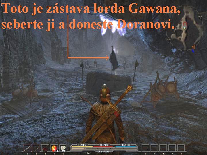 Probíjejte se dopředu, likvidujte Mrchožrouty, na konci odbočte vlevo a jděte doprava ke Kastelánu Gilthorovi, se kterým si promluvte a opět mu ukažte glejt. Ten ho ale současně nezajímá, po bitvě zůstalo na bojištích spoustu mrtvých, které je nutné rychle pohřbít. Starost má ale o jeho vlajkonoše, jménem Doran, který se nechce vrátit zpět do hradu, nebo přišel o Stříbrovodskou standartu. Máte ho najít a přivést nazpět, teprve potom bude mít Gilthor čas a chu řešit vaše záležitosti. O kousek dál vpravo si promluvte s Gundou, můžete si u ní nakoupit potřebné, popřípadě prodat nepotřebné, poté si doplňte vaše dovednosti (K) a můžete se vydat hledat Dorana. Vydejte se tedy na sever, narazíte na alchymistu Alzara, je šílený a přesto mu vyhovte, chce po vás, abyste mu našli a donesli houby smrtonoše z bitevního pole na severu Krvavého údolí. Pobijte vlky, vstupte do jeskyně, pohovořte s Khilianem, je vystrašený, bojí se a neví, čeho, takže ho vyveďte druhou stranou z jeskyně ven. Poté pokračujte vpřed, pokračujte na sever, probíjejte se přes vlky, po chvíli narazíte na Dorana, se kterým si rovněž promluvte. Je nešastný, nebo mu někdo sebral Stříbrovodskou standartu, tedy vlajku lorda Gawana, bez které se stydí na Stříbrovodský hrad vrátit. Rozhlédněte se po bojišti, seberte vše užitečné, co zde zůstalo po padlých bojovnících, poté nezapomeňte sebrat alespoň tři houby smrtonoše, poté se vydejte zpět k Alzarovi a houby mu předejte. Místo díků vás napadne, takže ho bez milosti zabijte. Postupujte na východ, zlikviduje všechny Gobliny Mrchožrouty, pokračujte po cestě vpřed. Zlikvidujte další Mrchožrouty, pobijte i je a vstupte doleva do jeskyně. V jeskyni jděte vpřed, pobíjejte Rypouše a mrchožrouty, jsou tu i drzé štěnice, sbírejte ze stěn železnou rudu i uhlí, tak dojdete až k zástavě lorda Gawana, kterou seberte (obr.3). Vracejte se zpět a jděte až na bojiště, kde Doranovi zástavu předejte, dál už se o něj starat nemusíte, vrátí se nazpět na Stříbrovodský hrad sám. Samozřejmě, že se tam teď vydejte i vy, projděte přes Údolí kajícníků, vchod je na jihu Krvavého údolí. Vydejte se tedy tím směrem, potkáte se s Jilvií, bude po vás chtít, abyste jí našli zlatý hrot z jejího šípu, což je znak jejího cechu. Ztratila ho prý v jeskyni, takže vstupte dovnitř, pobíjejte Gobliny a ostatní neřády, jeskyni prohledejte, jakmile naleznete zlatý hrot, vrate se ven a předejte ho Jilvii. Poté se vydejte k bráně hradu, promluvte si u brány se strážcem brány Normanem, požádejte ho o otevření brány, po chvíli váhání tak učiní, vstupte tedy na nádvoří. Promluvte si s oběma obchodníky, můžete si u nich i nakoupit, poberte s nimi všechny dialogy. Promluvte si s dalším strážcem, pak vstupte do hradu, pak po schodišti vystoupejte nahoru, kde si promluvte s Kastelánem Gilhortem. Požádejte ho o souhlas, abyste si mohli prohlédnout hradní archív. Ten vám ale poví, že svolení k tomu může dát jenom pán hradu, tedy lord Gawaan, který ale byl zajat Ergahem spolu s jeho skřety, takže lorda budete muset nejdříve najít a osvobodit ho.