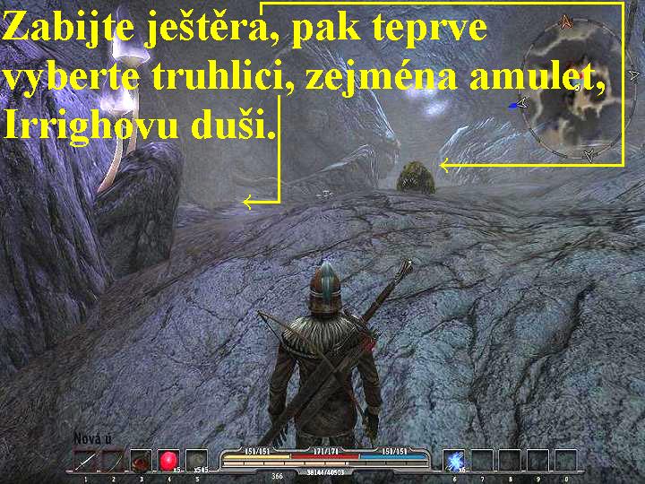 Vyjděte tedy ven na nádvoří, kde si promluvte se Semelou, mimo jiné vás požádá, abyste jí z divočiny u Stříbrných vod, nalezli tři kusy Rdesna a donesli je jí zpět. Poté si pohovořte s kovářem Welgardem, i s ním proberte všechny dialogy, vyjděte z hradu ven a vydejte se na východ. Pobijte houfec skřetů, zlikvidujte i Polní škůdce, vpravo u věže se puste do souboje se Šurakem. Porazte ho v souboji, tak vás pustí nahoru do věže, kde nad schody otevřete paklíčem truhlici a vyberte ji. Vrate se ven a vydejte se na sever, promluvte si se skřetem Ogbošem. Bude po vás chtít, abyste mu sehnali kořalku mrchovodku, kterou umí připravit jen šaman Melog, pak vás do jeskyně, kde je vězněn Gawaan Erghardem pustí. Vracejte se tedy od brány zpět, odbočte doleva, pobijte Polní škůdce, utíkejte vpřed, přeběhněte přes můstek, pobijte Gobliny, aktivujte teleport, vstupte do chatrče, kde si promluvte s Melogem. Posbírejte všechny elixíry, poví vám, že mrchovodku vám dá jen tehdy, pokud naleznete Irrigha a pošlete ho za ním, poté si ještě promluvte s Lesterem, i ten vás žádá, abyste nalezli Irrigha. Vydejte se tedy dál na západ od chatrče, zde naleznete Irrigha, promluvte si s ním, dozvíte se od něj, že Šalog mu sebral jeho duši, což je ovšem Irrighův amulet. Slibte mu tedy, že ho naleznete, a poté ho pošlete k Melogovi. Vy se pak vydejte po cestě, která se stáčí na jih, kde po chvilce Šaloga naleznete. Promluvte si s ním, přizná se vám, že Irrighův amulet sebral, ale nemá ho, schoval prý ho do truhlice v nějaké jeskyni. Vydejte se tedy vpřed, pobijte několik Číhavců, seberte zde i tři rostlinky Rdesna pro Semelu, vydejte se po cestě vedoucí dál na východ k jeskyni. Pobijte Jedozuby, a vstupte do Ještěří jeskyně, pobijte houfec Jedozubů, postupujte jeskyní vpřed, likvidujte Gobliny, sbírejte užitečné předměty, tedy rostliny, rudu a uhlí, tak dojdete až k ještěrovi, vlevo od něj je vámi hledaná truhlice (obr.4). Zabijte tedy nejdříve ještěra, který stráží truhlici, poté truhlici vyberte, je v ní mimo jiné i Irrighův amulet. Nyní tedy jeskyni opuste a vracejte se k Melogově chatrči, amulet předejte Irrighovi, poté to oznamte Melogovi. Irrigh se ale chce stát náčelníkem jeho kmene, Erhag je ale příliš silný a navíc je obklopen strážci. Promluvte si tedy znovu s Irrighem, navrhněte mu, a vám dá jeho amulet a tak se stanete Irrighovým synem a souboj s Erhagem svedete sami jeho jménem. Irrigh samozřejmě souhlasí, jakmile vám amulet předá, vydejte se zpět ke skřetímu táboru, předejte Ogbošovi kořalku mrchovodku, vyptejte se ho na všechny podrobnosti, tak vám otevře bránu a do jeskyně vás pustí. Jděte až na konec, tem na trůnu sedí Erhag, obklopen strážci, vyzvěte ho na souboj jménem syny Irrigha. Erghard je skutečně až neuvěřitelně silný a odolný, volte tedy tu nerazantnější obouruční zbraň, puste se do boje. Pokud vám bude docházet zdraví, běhen souboje lze používat pouze uzdravující jablíčka, nikoliv obvazy, utíkejte z jeskyně ven, kde si doplňte zdraví na maximum a vrate se zpět pokračovat v souboji. To lze zopakovat i několikrát, takže nakonec Ergharda i jeho pochopy porazíte, poté vstupte za trůn a promluvte si s Gawaanem, osvobodíte ho, ale bude mít na vás prosbu. Chce po vás, abyste zachránili jeho vojáky, které drží v zajetí Zargaš Krutý pro stavbu dalšího třetího opevnění. Navíc ještě na loukách u pobřeží ještě hlídkují vojáci ze skupiny Ur-Šula a Harga, což jsou Zargašovi kumpáni, i ty máte porazit. Vyjděte z jeskyně ven, u brány sdělte Ogbošovi, že Erhag je mrtvý, vydejte se po cestě dolů a odbočte doprava. Tak narazíte na Zargaše, zabijte ho i s jeho přisluhovači, tak osvobodíte Gawaanovy vojáky. Poté si promluvte s jejich velitelem Aricem, a sdělte mu, že vás posílá Gawaan a pošlete je domů. Nyní se po stejné cestě vracejte zpět, po chvíli odbočte doprava a po cestě kolem rybníka pokračujte vpřed k hradu. U hradní brány si promluvte se strážným Normanem, vstupte na nádvoří, dívce, jménem Semele, pak předejte tři rostlinky Rdesna, u Gundy si můžete nakoupit, či prodat zboží. Poté vstupte do hradu, vyhledejte lorda Gawaana, promluvte si s ním. Sdělte mu, že vámi osvobození jeho vojáci jsou již na cestě zpět na hrad, získáte tak od něj povolení prohledat hradní archívy, snad tam najdete nějaké to vodítko, v kterých místech hledat posvátný chrám. Archiv naleznete ve sklepích pod jižním traktem hradu, kde také naleznete mapu Argaanu, jenže na ní není zaznamenán vrcholek hory, takže neznáte cestu k němu. Vrate se tedy nazpět k lordovi Gawaanovi a všechno mu povězte. Obdržíte od něj magický svitek, který dokáže odstranit sutiny, bránící vám pokračovat v cestě do Tooshoo, neprozradí vám ale, jak tento svitek funguje, to se dozvíte až na místě samém. Vyjděte tedy z hradu a vydejte se kolem rybníku na jih na hranici území. Známou cestou na jih tak dojdete až k Melogově chatrči, pokračujte vpřed, likvidujte Číhavce a Gobliny, tak se dostanete až k závalu. Odstraňte jej pomocí kouzelného svitku od lorda Gawaana, poté co se zával rozpadne, zlikvidujte v souboji Kamenného Golema. Pokračujte po cestě vpřed, po chvíli se spustí animace, po jejím skončení v reálu pokračujte po cestě vpřed. Na mostě si promluvte s Lebarosem, bude po vás chtít, abyste mu nasbírali šest kusů číhavých vajec. Pokračujte tedy dál, pokecejte s obchodníkem Borranem, proberte s ním všechny nabídky dialogů, můžete si u něj i nakoupit, či prodat některé předměty. Pokračujte vpřed, promluvte si s Třasákem, chce po vás, abyste mu našli jeho vak, který prý ztratil někde u Číhavčího hnízda
