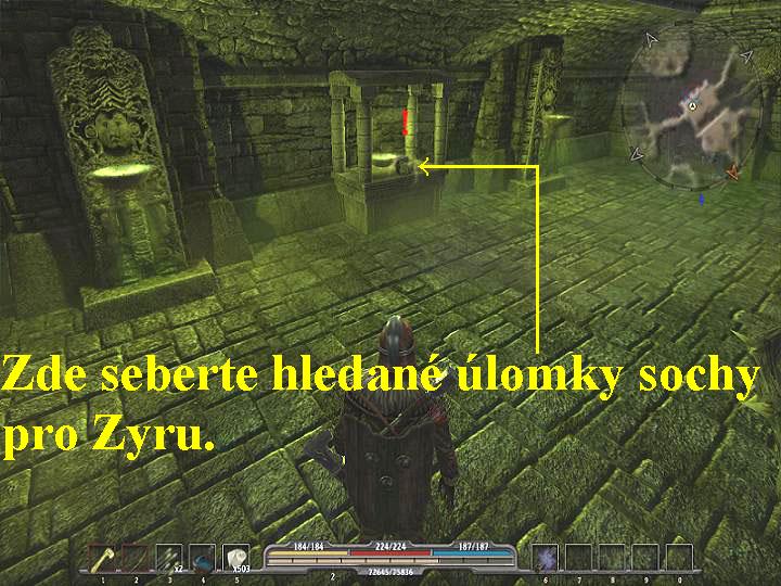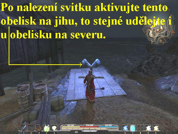 Tam se dostanete přes hřbitov, pokud nevíte jak, zeptejte se Gorna, ten už jednou přešel přes hřbitovní vrata na severu města. Seběhněte tedy po cestě dolů, pobijte Kostlivce a Paladiny, pokračujte přes kamennou bránu vpřed, tak dojdete až na hřbitov, kde si promluvte s Gornem. Poté vstupte do podzemní chodby, probíjejte se stále vpřed přes různé nepřátele, cestou vyberte pět truhlic, na druhé straně vyběhněte ven na volné prostranství. Zlikvidujte několik Kostlivců a Mágů, pokračujte vpřed, nyní musíte zlikvidovat poletujícího Vůdce démonů a několik nově se objevujících Zombií, abyste si otevřeli cestu do Xardasovy věže a k jeho prvnímu teleportu. Jakmile se tedy všech těchto bestií zbavíte, vyběhněte po schodech až nahoru, kde aktivujte první teleport (obr.7). Spustí se výmluvná animace, po jejím skončení pak v reálu pokračujte k dalšímu teleportu a přes něj potom až k Xardasovi, se kterým si promluvte a proberte s ním všechny nabídky dialogů. Tak se mimo jiné dozvíte, že proradná Xesha napadla Klášter a udělá vše pro to, aby vám znemožnila donést amulet, tedy Spáčovu peče, na určené místo, jak si to přeje Xardas. Xardas totiž chce, abyste Spáčovu peče donesli do jeskyně pod Klášterem, která se nachází na východ od Bažin. Naneštěstí pro vás však Xardas neví, kde přesně se nachází vchod do jeskyně, to budete tedy muset zjistit vy sami. Navíc Xesha vyslala několik Démonů, které musíte do jednoho zlikvidovat. Vaším úkolem tudíž nyní je donést Spáčovu peče na určené místo do Svatyně, najít vchod do jeskyně a porazit všechny Xeshiny Démony. Vyberte tedy všechny truhlice, posbírejte vše užitečné a vydejte se do jeskyně.