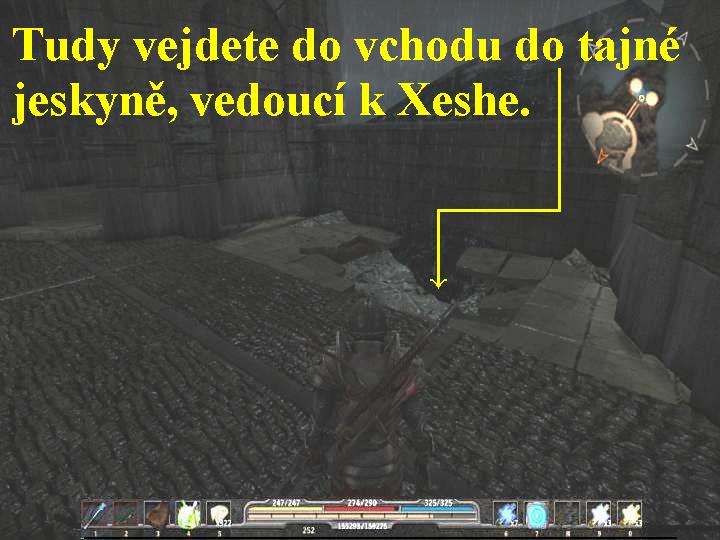 Nyní vyjděte od Xardase ven a vydejte se po kamenech ve vodě ke vchodu do jeskyně, který velice lehce najdete. Jeskyně je obrovské a dvoudílné bludiště, spuste si tedy mapu (M-podzemí) a probíjejte se jeskyní stále vpřed, musíte zlikvidovat spousty Golemů, Kostlivců, Ohnivých poletujících a jiných bestií, tak u Ohnivého kněze naleznete klíč, který seberte. Postupujte stále vpřed, až dojdete ke kamenným dveřím, které si tímto klíčem otevřete. Probíjejte se stále dál na východ jeskyně, tak se postupně probijete až k východu z jeskyně, kde vás napadne několik Ahn ´Bael a Ohnivý Démon. Musíte je všechny zlikvidovat, jen tak si potom budete moci promluvit s Ruhndalem, proberte s ním všechny nabídky dialogů, tak získáte informace pro vaše další putování. Po skončení rozhovoru se vydejte do Kláštera, který je ale už celý v plamenech. Po cestě opět narazíte na spousty roztodivných nepřátel, jako jsou Obří Démoni, Obsidiánovi kněží, Kamenní Golémové, probijte se tedy celou Černou soutěskou, vyběhněte po schodišti výš a stále se probíjejte vpřed, pobíjejte stále Obsidiánovi i kněze, vyběhněte ještě výš po dalších dvou schodištích, probíjejte se dál před Poletující a Obsidiánovi kněze, vyběhněte další schodiště, zlikvidujte Pány Démonů a další Obsidiánovi kněze. Po protějším schodišti vyběhněte nahoru, kde si promluvte u Svatyně s Hendorem, u Candara si můžete nakoupit, co potřebujete. Počítejte s tím, že na vás bude čekat finální souboj s Xeshou a jejími přisluhovači, tak vybírejte pečlivě a uvážlivě, hlavně se zásobte dostatečným množstvím uzdravujících prostředků. Najděte vchod do podzemní jeskyně, jejíž chodba vede už k Xeshe (obr.8), probijte se vpřed přes Obsidiánovi kněze, Kostlivce a jiné bestie, tak dojdete k východu z chodby, kde už na vás čeká Xesha. Puste se s ní do souboje, bude vám unikat, má totiž schopnost se rychle přesouvat z místa na jiné vzdálenější místo, často se tyje i za kouřovými modrými průchody, kterými neprojdete a které ani neprostřelíte. Přitom na vás bude soustavně střílet magickými střelami, během souboje na vás použije i trny, které vyvolává ze země a jež vás velice mohou oslabit, ne-li přímo zabít. Po několika výstřelech se vždy Xesha znovu ukryje, pokud se znovu objeví před vámi, můžete s ní dál bojovat. Střílejte po ní z té nerazantnější kuše, není radno se k ní moc přibližovat, jejím střelám se vyhýbejte do stran, využívejte i možnost provádět úhybné kotouly. Po několika únicích od vás vyvolá své přisluhovače, tedy Kostlivce a dokonce i Golemy, se kterými budete muset bojovat, přitom uhýbat jejím magickým střelám, takže budete mít spousty práce. Souboj je to náročný a těžký, však je to také finále hry, ale zvítězit skutečně lze. Je však nutné se v průběhu boje stále uzdravovat, obvazy v průběhu boje jako vždy používat nemůžete, takže se krmte uzdravujícími lektvary, ovocem a jinými dostupnými prostředky, posilujte sílu a regenerujte manu, před bojem si doplňte vaše schopnosti (použijte klávesu K), hlavně sílu a přesnost na maximum, pokud vám ovšem ještě zbyly nějaké ty body pro využití této možnosti. Jakmile Xeshu a všechny její pomocníky porazíte, máte vyhráno a spustí se závěrečná animace, z níž se dozvíte příčiny a důsledky celého vašeho konfliktu. Jen se mi zdálo, že si z vás autoři tak trochu „utahují“. Potom už následují jen závěrečné titulky a vy máte hru úspěšně za sebou.