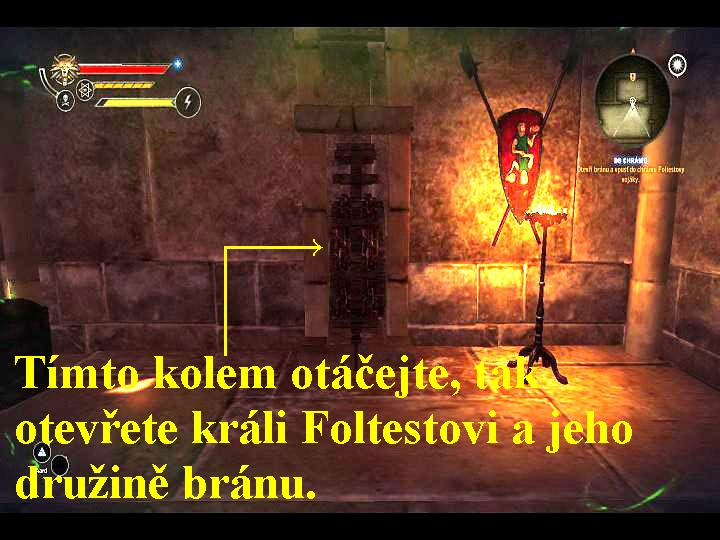 Odlákejte stráe za bránou, vstupte bránou dovnitř, v animaci srazíte dolů