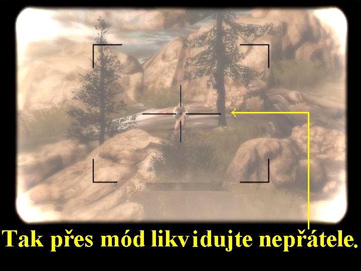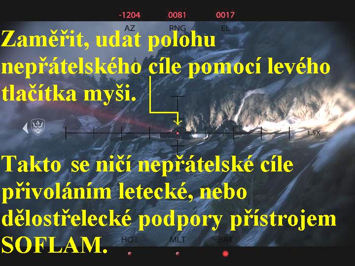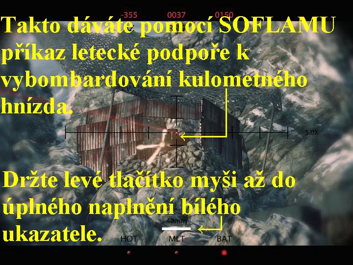 Vzdušné údery z posledních misí byly tedy velice úspěšné, takže nyní se budete muset společně s Dustym vydat výš do hor, abyste vyhledali zakopané bojovníky Talibánu a AL-KAJDY. Berte na vědomí, že tato výprava je velice nebezpečná, dobře se tudíž kryjte, buďte obezřetní, abyste se nakonec nestali z lovců pouhou kořistí. Ocitli jste se tedy společně s Dustym v dolině pod horami, po chvíli se vám automaticky spustí zaměřovací mód vaši sniperky a vaším úkolem bude zlikvidovat všechny nepřátele, jejich minometná hnízda a odstřelovače, zkrátka vyčistit hory před vámi ode všech nepřátel. Poté, co se vám tedy zapne zaměřovací mód, začněte vyhledávat nepřátele a likvidujte je z vaší sniperky (obr.2). Jako první najděte tábor Talibánců a zlikvidujte první tři nepřátele. Zapínejte si HUD (H), tak zjistíte, kde se nacházejí další nepřátelé, při střelbě ještě zadržujte dech (levý Shift), tak se vám mířidla ustálí, navíc vám bude po celou dobu pátrání radit i sám Dusty, kde hledat další nepřátele. Poté, co vyčistíte hory před vámi od všech Talibánců, automaticky se přepnete zpět do reálného módu. Rychle a z úkrytu postřílejte všechny nepřátele, kteří na vás zaútočí, poté se otočte, přeskočte zídku a jděte za Dustym, z úkrytu postřílejte další teroristy dole pod vámi. Poté, co Dusty podá hlášení o výsledky akce, následujte ho do kopců, kde z úkrytu postřílejte houfec na vás útočících Talibánců. Skrčte se a podlezte pod spadlým stromem, následujte Dustyho, na konci srázu zalehněte a postřílejte všechny nepřátele dole pod vámi. Jakmile se vám to podaří, vstaňte a znovu následujte Dustyho, budete se muset prostřílet přes hustou kouřovou clonu, ze které na vás zcela překvapivě a nečekaně vybíhají stále další vlny nepřátel.